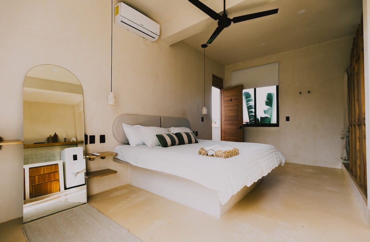 Acogedora suite con cama Queensize, Smart TV, Aire acondicionado, ventilador de techo, cocina, baño y jacuzzi privado. Disfrute de los atardeceres y relaje su mente mientras contempla la vista panorámica de la ciudad, el océano y las montañas desde su jacuzzi privado. Nos encontramos en Punta Zicatela, a 7 minutos caminando de la playa, principal punto de surf, restaurantes, bares y zona comercial. Cerca de todo, pero fuera del bullicio de la fiesta. Contamos con Internet Starlink.