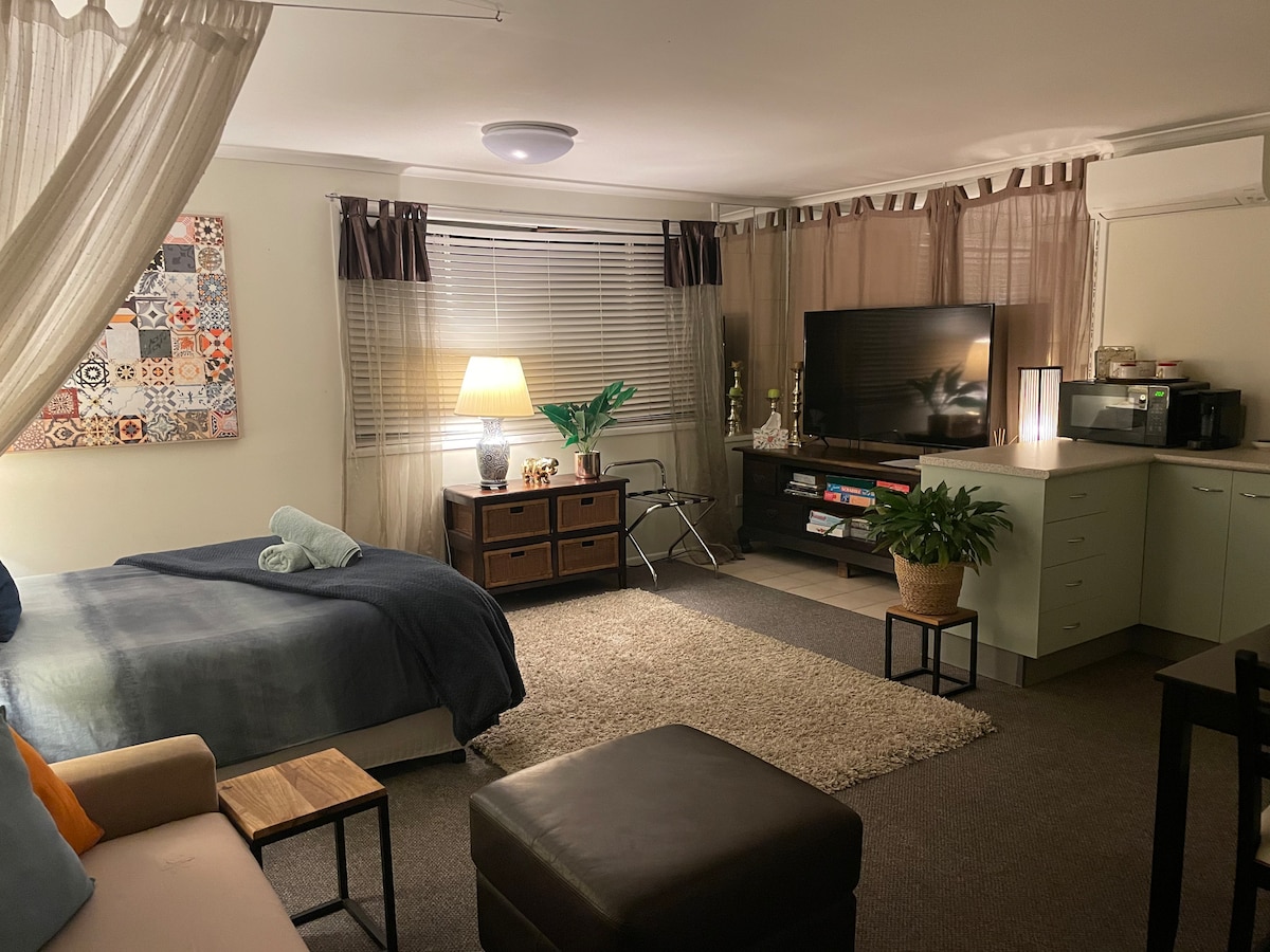 Airport just minutes by car! Entertainment Centre - 3 mins by train. City and beyond - catch a train via a 4 minute walk from your studio. Just minutes off the Gateway Motorway (M1) making it perfect in every sense! Breakfast provisions incl. Presenting an airconditioned stay that is, Boho - Boutique - Bountiful ..Different Your own private access takes you into a newly built self contained, dog friendly studio delightfully created out of personal experiences with bespoke touches.