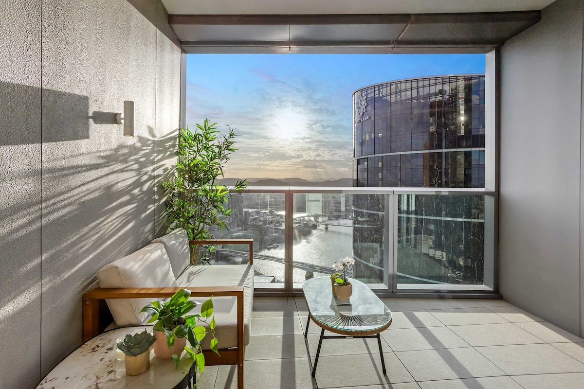 Soar above the city and unwind in serene, sky-high luxury at the New Queen’s Wharf. Perched on the 59th floor, this beautifully brand new curated apartment combines calming nature-inspired interiors with jaw-dropping, uninterrupted views of Brisbane’s skyline, river, and mountains. Step into a tranquil space where soft earthy tones, natural textures, and luxe finishes create the perfect retreat—whether you’re here for business, a romantic escape, or a peaceful getaway in the heart of the city.