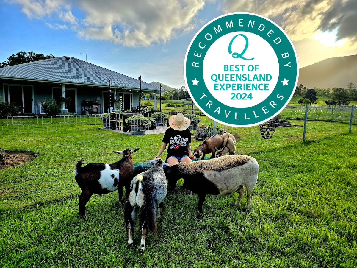 Fig Tree Farm B&B is set on 5.5 acres in Highvale and is located only 7 minutes from popular Samford village. Interact with friendly goats, sheep, ducks, cows, chickens and guinea pigs during your stay. A breakfast basket welcomes you on arrival and fresh bread is baked every night in the cottage. Collect your own eggs to cook daily from the coop. The cottage has 3 bedrooms, air-con, WIFI, twin heated outdoor baths, BBQ, firepit, king master bed and 2 bathrooms. Max 6, inc infants, in total.