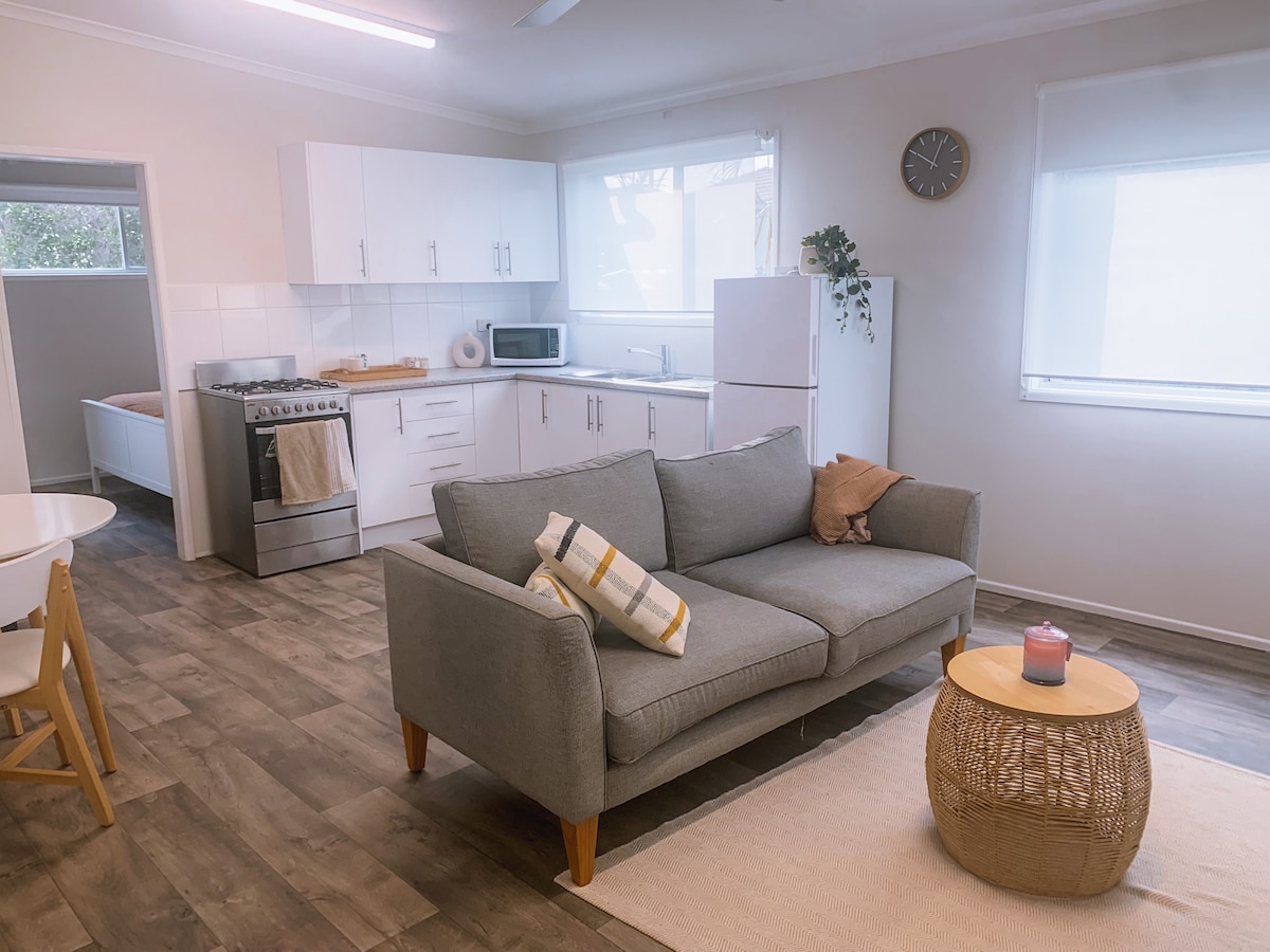 The Little Scandi Studio is modern, bright and clean. A little bit of Luxury and privacy in the suburbs. The Little Scandi Studio is one room 14.2sqm there is a large Queen bed a fully equipped kitchenette and modern bright separate bathroom. The Little Scandi Studio has a small outdoor deck a BBQ with table and 2 chairs contained in a secure courtyard. Which also has a washing machine.