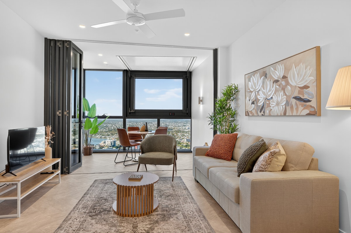Soar above the city and unwind in serene, sky-high luxury at the New Queen’s Wharf. Perched on the 59th floor, this beautifully brand new curated apartment combines calming nature-inspired interiors with jaw-dropping, uninterrupted views of Brisbane’s skyline, river, and mountains. Step into a tranquil space where soft earthy tones, natural textures, and luxe finishes create the perfect retreat—whether you’re here for business, a romantic escape, or a peaceful getaway in the heart of the city.