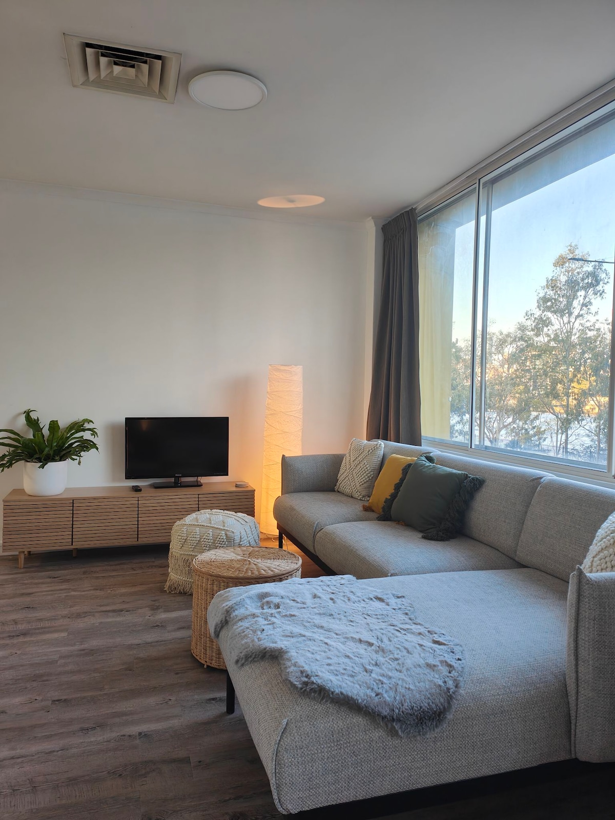 Bedroom opens on to living room with floor to ceiling glass sliding doors, opening out to a large & usable balcony; Comfy lounge, Wi-Fi, Netflix; Combined Air Cooling & Heating; Well appointed kitchen; Modern bathroom with rain head shower & hair dryer; Laundry including washing machine & dryer; Easy self check-in any time via lock box; There is no designated car park, but there are plenty of visitor car spaces which are available most of the time.
