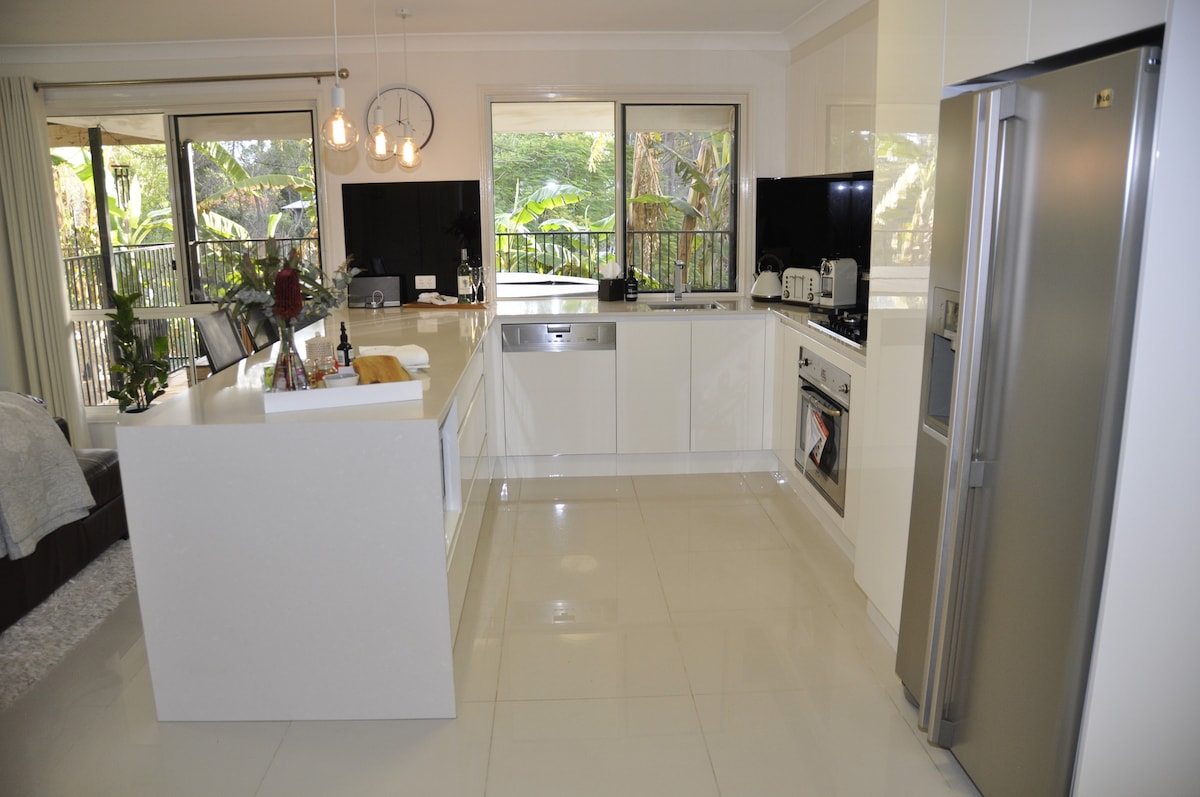 We offer a delightful Eco-friendly, tranquil & modern self-contained 3-4 BD 1 bath Apt. Note, we live upstairs, in our "Queenslander" style home (totally separate). Guests, please enjoy a sense of luxury, our spa, bush setting & native wildlife provide a perfect place to relax. Perfectly located near wedding venues. 15kms from Brisbane CBD by car/bus. Walk dist. to restaurants, bottle shop, IGA. 30 min drive from the BNE airport, via tunnels. Central for Theme Parks, Lone Pine etc.