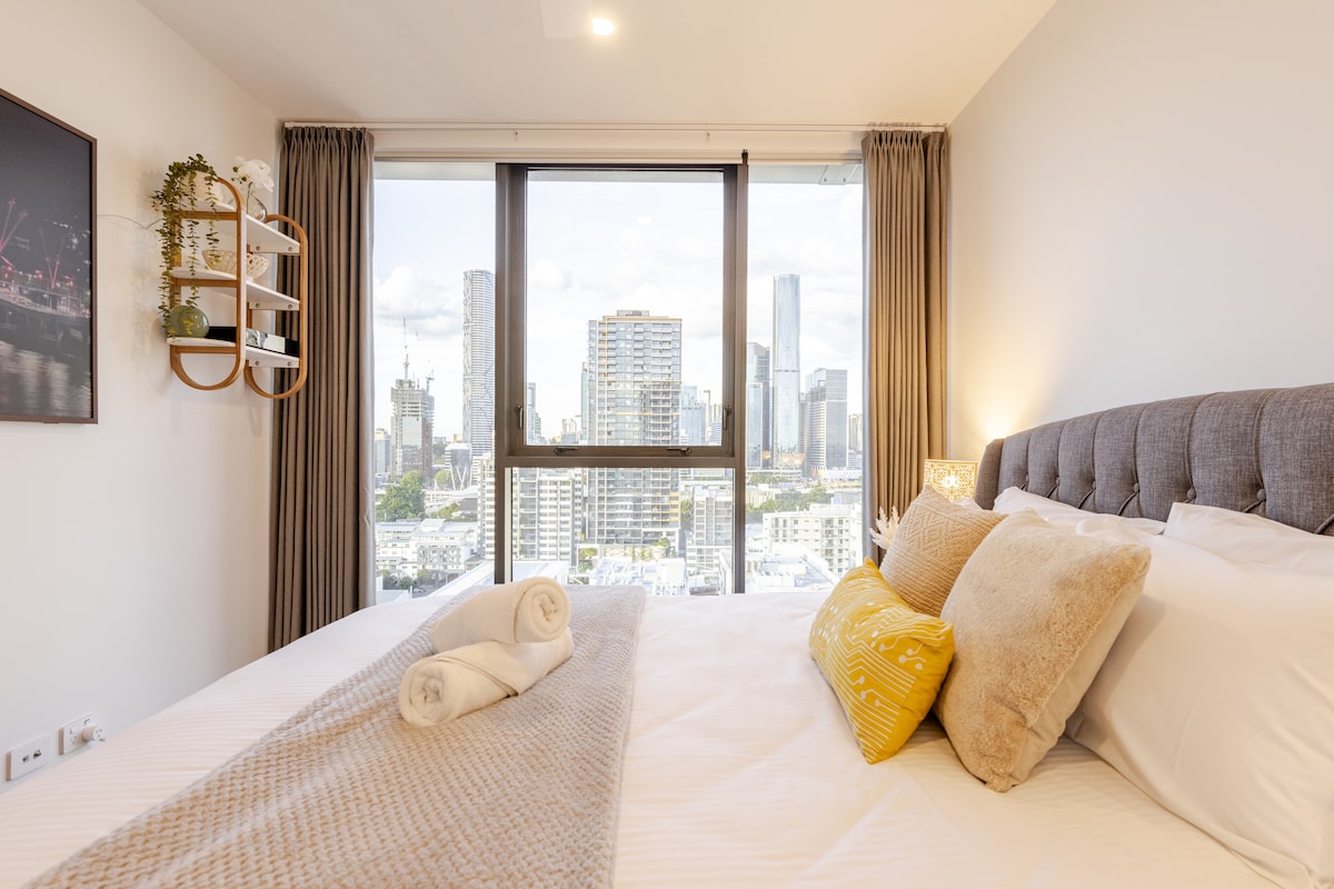Soar above Brisbane in a stylish two bedroom, two bathroom residence at Spire Apartments 🏙️, offering skyline and river views through floor to ceiling windows and a private balcony. Open plan living connects to a fully equipped kitchen, perfect for relaxing or entertaining. High speed Wi-Fi and a smart TV ensure easy downtime. Enjoy the rooftop infinity pool, gym, and BBQ terrace 🏊, ideal for sunset views 🌇. Close to dining, shopping, and river walks, with pet friendly stays on request 🐾.