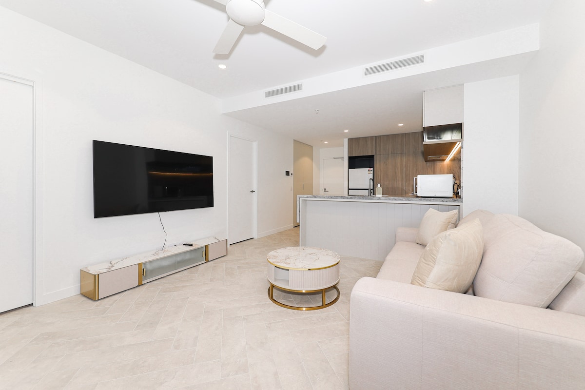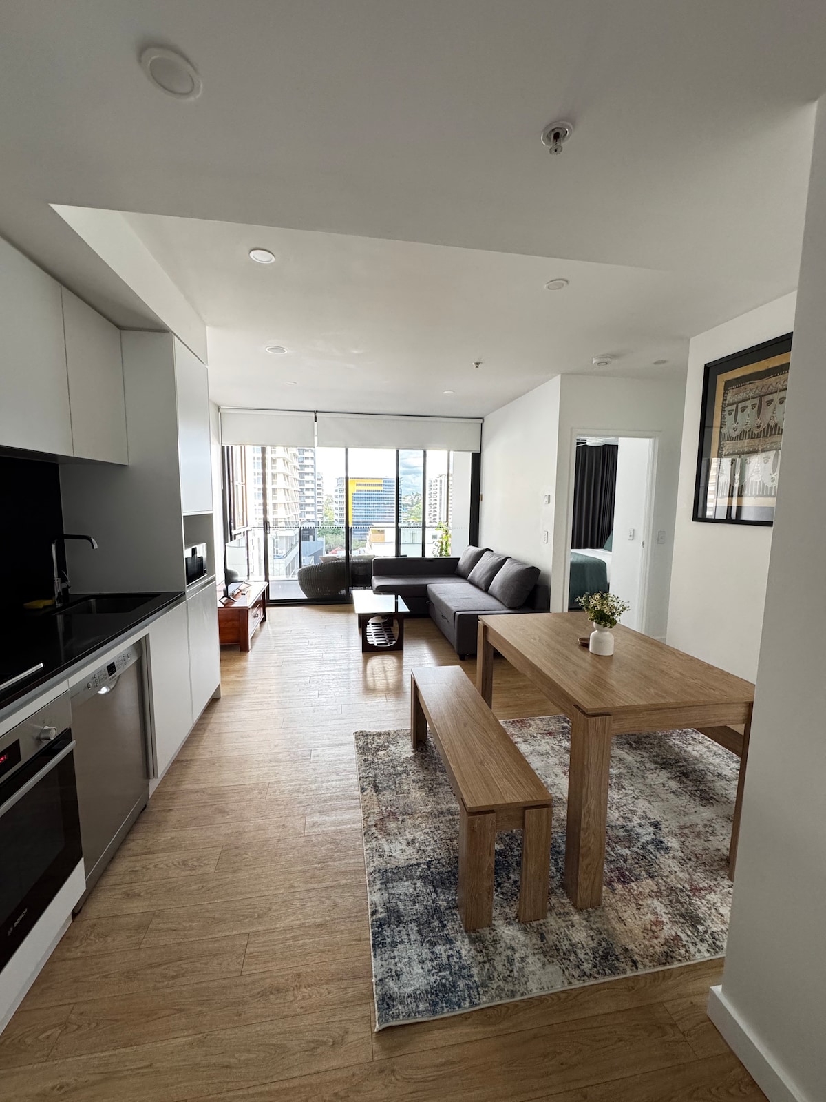 Bedroom opens on to living room with floor to ceiling glass sliding doors, opening out to a large & usable balcony; Comfy lounge, Wi-Fi, Netflix; Combined Air Cooling & Heating; Well appointed kitchen; Modern bathroom with rain head shower & hair dryer; Laundry including washing machine & dryer; Easy self check-in any time via lock box; There is no designated car park, but there are plenty of visitor car spaces which are available most of the time.