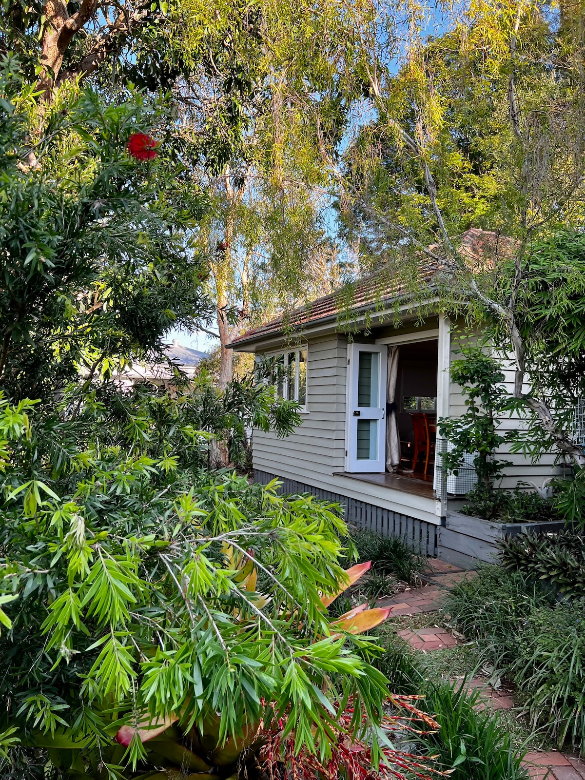 You'll love the leafy views from our self-contained garden cottage. We are high on the hill in convenient Mitchelton with great NNE aspect. It's 150m to a fabulous suburban cafe and not far to a major shopping centre, the suburbs quaint shopping area and train - 18 minutes to town. The studio space has a well-equipped kitchenette, bathroom, washing machine, TV, unlimited WiFi and air-con. There's a made queen size bed (and if needed a spare mattress with linen supplied for guests to make)