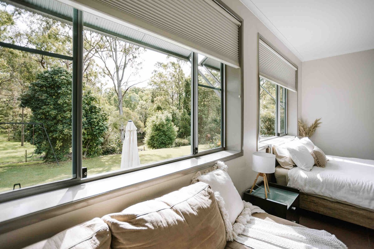 This cottage offers a peaceful quiet place to stay with a view into Australian bush. Whether you are holidaying, relocating to Brisbane, are waiting for your forever home to be built, this is the perfect place for families. We are located 30 min from Brisbane, 20 min from the airport, 20 min to Cleveland and 10 min to Sirromet Winery. You will have private patio where you may see wallabies, koalas and ample birdlife, also an outdoor bath spa, a large firepit and lush greenery for you to enjoy.