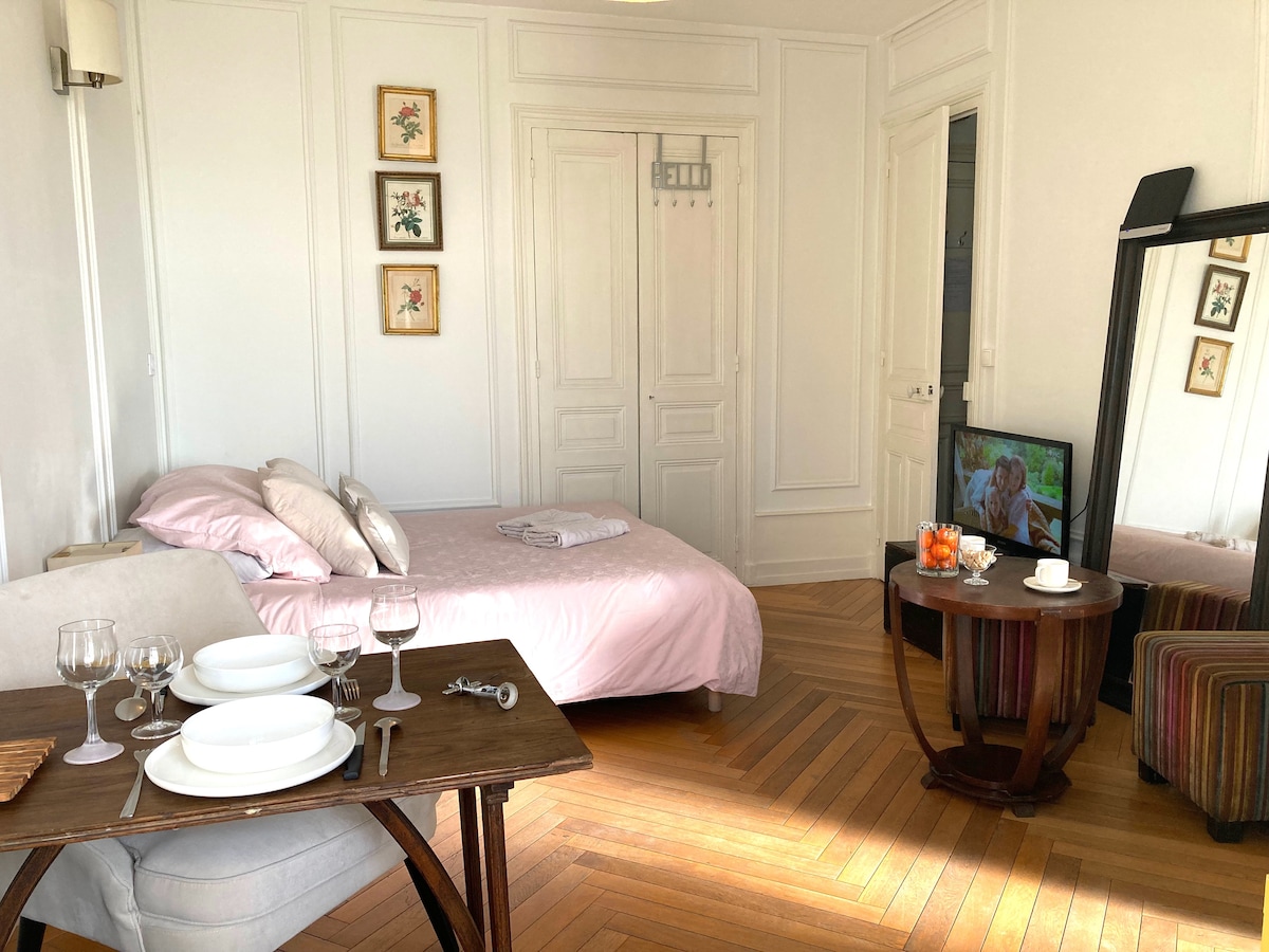 Joli Studio rénové avec goût, situé dans un ancien palace d'Aix les Bains à 2 pas du centre-ville (Casino, Office de Tourisme, Commerces, Parc de verdure). Parfait pour votre séjour en cure, un séjour professionnel, votre stage ou vos vacances en Savoie. Résidence calme sécurisée par digicode. Pour un séjour supérieur à 7 nuits : je vous demanderai un chèque de caution de 300€ que je vous rendrai à la fin de votre séjour. Linge de lit fourni. English / Italiano.