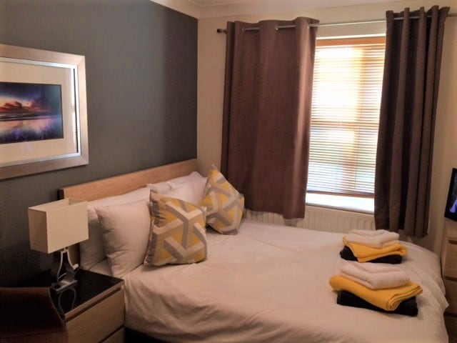 This two-bedroom serviced apartment for short-term rental in Bristol creates a welcoming retreat. Muted painted walls and modern furnishings set a sophisticated tone, while the thoughtfully planned open layout provides genuine space for families or groups. The sleek kitchen anchors the living area, both bedrooms offer peaceful sanctuaries, and high-end finishes throughout ensure quality at every turn.