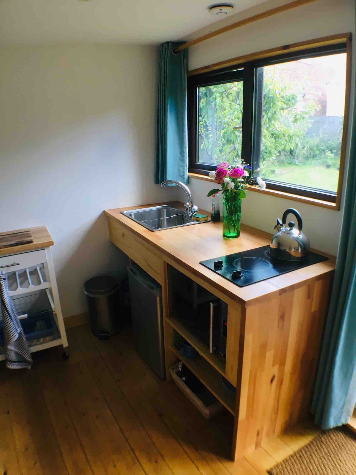 Gorgeous self contained garden cabin . With own kitchenette and bathroom .Queen bed and small double sofa bed sleeps up to 4. May be a squeeze for 4 adults . If you don’t mind being cosy . Separate entrance from main house and free street parking. 15 minute drive into town centre . Good bus routes. Quiet and tranquil. Can see main house from the cabin but it’s not imposing .