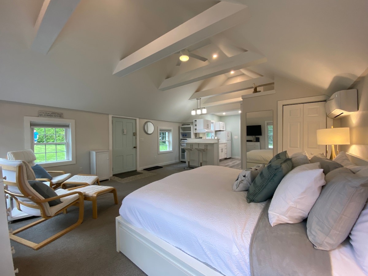 Guesthouse with 2 light-filled floors, parking, slate patio and 4 acres of open space. 2nd floor: lofted sky-lit bedroom. 1st floor: kitchenette/dining area with separate sitting/office space, and a full bath with additional attached outdoor shower. Walk to Adamsville with shops, food, and water access. Enjoy the best of Little Compton in this architectural treat. Four night minimum high season. Contact for monthly & weekly discounts, and needs outside nightly minimum. Welcome !