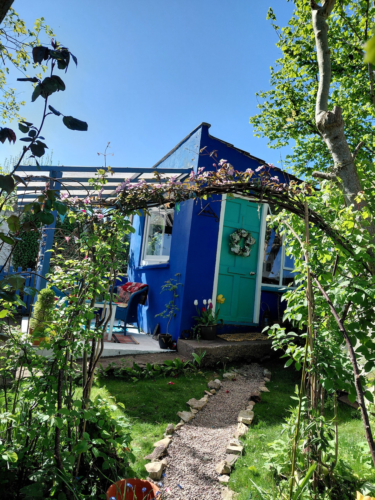 Our cottage is a quirky wooden framed, tin clad cottage, sitting on the banks of a stream, next to our house. Although small it feels much bigger with a fully equipped kitchen, bedroom and bathroom. It can sleep 4 people with the use of the sofa bed. It features a wood burning stove, (it also has central heating ;-)), a gorgeous mural across one wall, a veranda for sitting and watching the world go by, oh and it also has full WiFi, smart TV and sound system if this all sounds a little rustic.