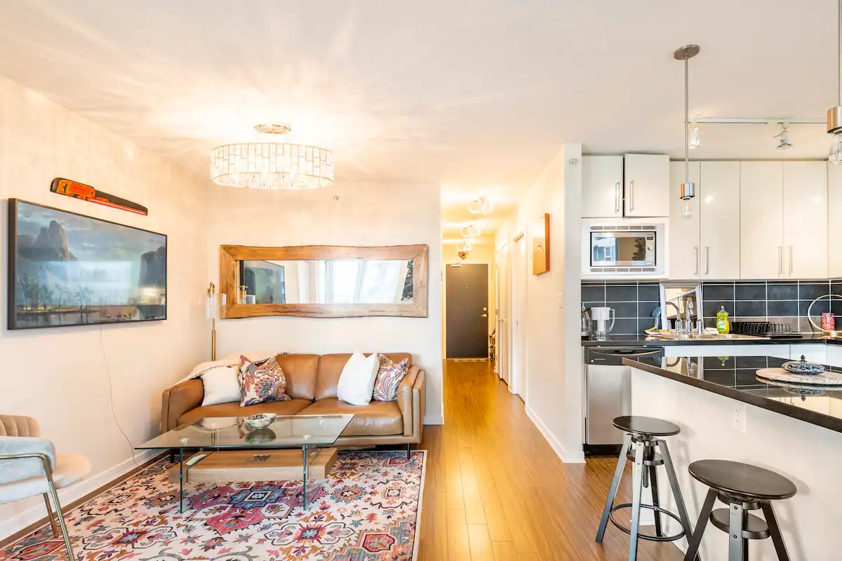 Very clean modern condo suite. Privately owned and managed by your host James. Access via smart lock. No check-in or check-out. Professionally cleaned. Laptop friendly workspace. Free high speed internet, cable, prime video, park pass, parking and storage locker. One bedroom with oversized king bed. High quality queen sofa bed in living room. Accommodates up to 4 adults. Open concept kitchen, dining and living area. Scenic balcony view of the mountains. Many amenities and condiments provided.