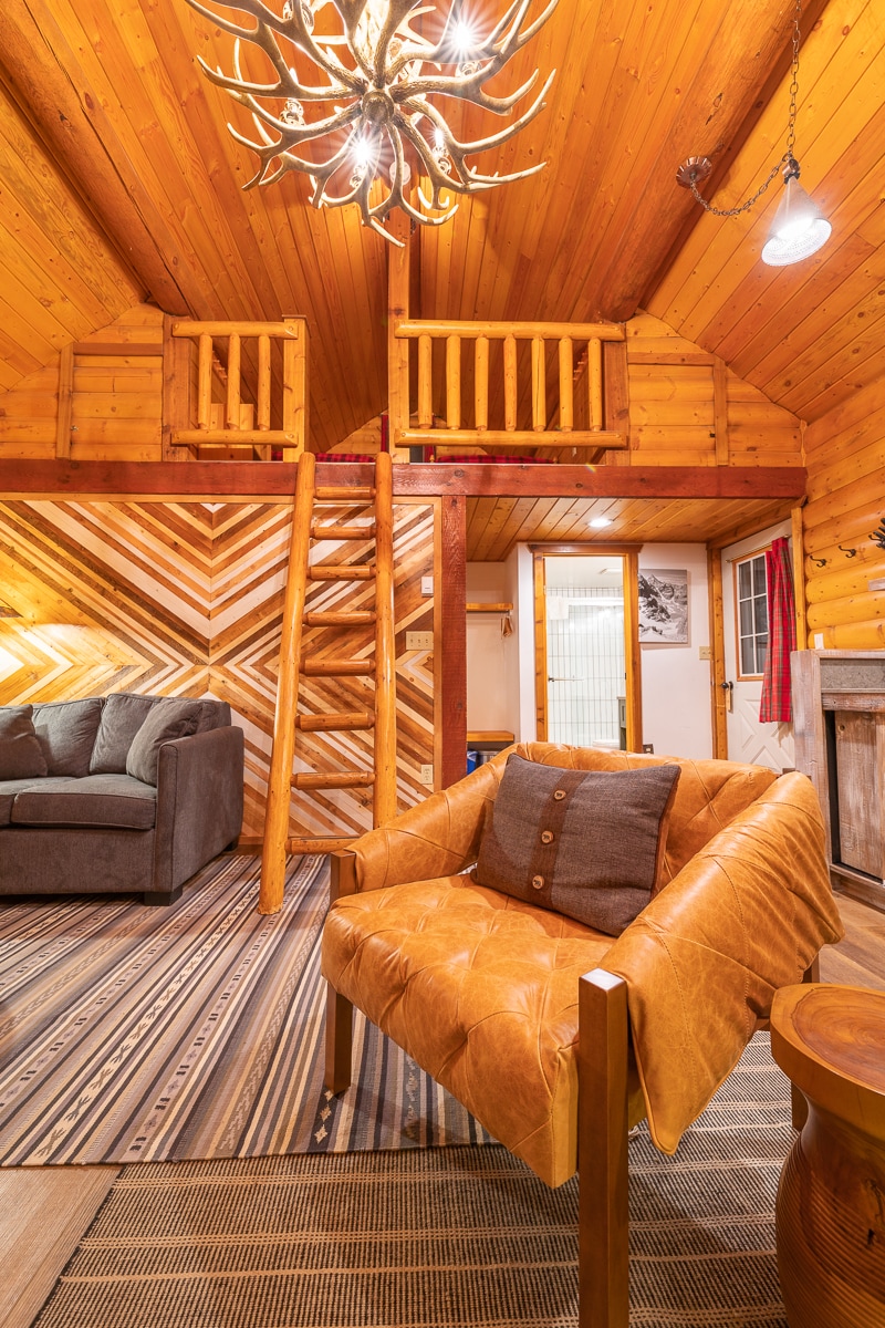Experience our updated 1 Bedroom + Loft Cabin Bedroom Cabin with a queen log bed downstairs, twin beds in the loft, seating area, river rock fireplace, private deck with mountain views, a library wall, record player, and board games. Enjoy the kitchenette with induction stovetop, microwave, mini-fridge, kettle, French Press, Chemex, hairdryer, and heat. All suites and cabins have private entrances for added comfort.