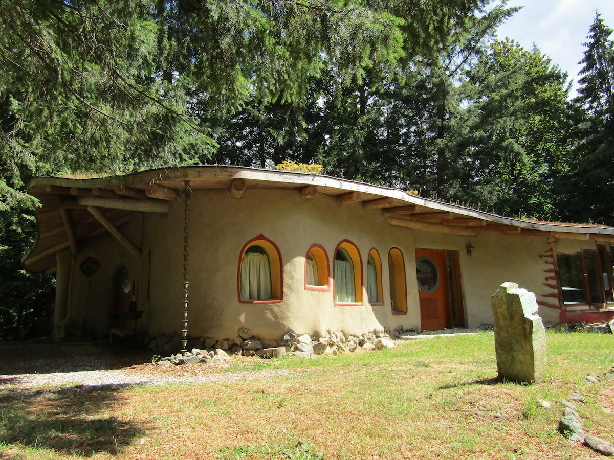 Channel the pursuit of pause in this one-of-a-kind earth house. The cozy retreat was hand-sculpted using local and sustainable natural materials, and features a central living space with cantilevered slab stairs leading to the loft bedroom. Guests have access to the entire cottage and surrounding property. We live in the neighbouring house, and are happy to give advice or answer questions to help you make the most of your stay. The neighborhood is quite rural and mostly agricultural with several farms and a small private vineyard. The home is a 10 minute walk from the beach and a 20 minute walk from a family grocery and deli specializing in local organic produce. Mayne Island has a small community bus. Times and routes are limited, particularly in the winter. It will stop at the driveway. We also have an official hitch hiking system with signed Car Stops where you can wait for a ride. Usually you don't have to wait long. We are happy to offer pickup and drop off at the ferry dock as a courtesy to encourage car-free travellers, on days when the community bus is not running. Please let us know ahead of time that you'll be coming without your own transportation, and we will make sure that either we or the community bus (which will drop you off at our driveway) are there to meet you when your ferry arrives. The BC Ferries terminals near Victoria and Vancouver are easily reachable via public transit from their respective airports and downtowns.