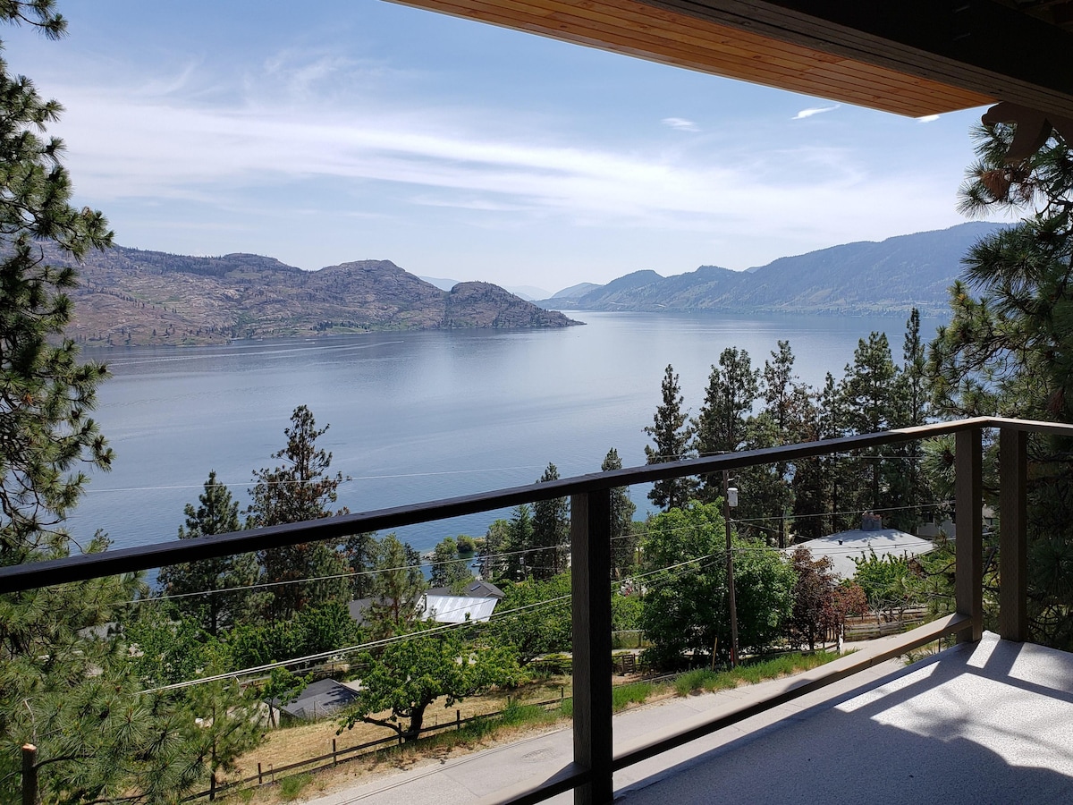 The Blue Horizon Suite Peachland Eagles Nest B&B, a place to fall in love, relax, think and plan. The Blue Horizon Suite is 600 sq feet and will accommodate 1 to 4 guests. You open the gate and step onto your private deck with an OMG view south of Lake Okanagan. The deck is fitted in amongst the Ponderosa pines and you will have many feathered visitors. The deck has glass railings so you can see the lake and mountains while you sip some fine local wine.
