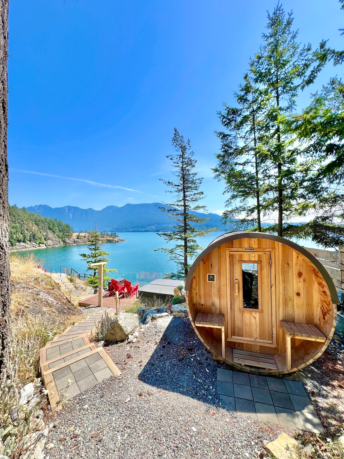 Relax in the jacuzzi on the sea deck, then enjoy a steamy sauna followed by dip in the cold barrel .Wake up each morning to the sound of the sea lapping at your private deck and enjoy our freshly cooked Aussie breakfast and a hot frothy latte. Experience the unique restored property, once a Custom House and shellfish cannery. Just minutes Ganges village the suite offers a private seaside entrance, vaulted ceilings, and travertine stone floors for modern comfort—. A memorable stay awaits you.