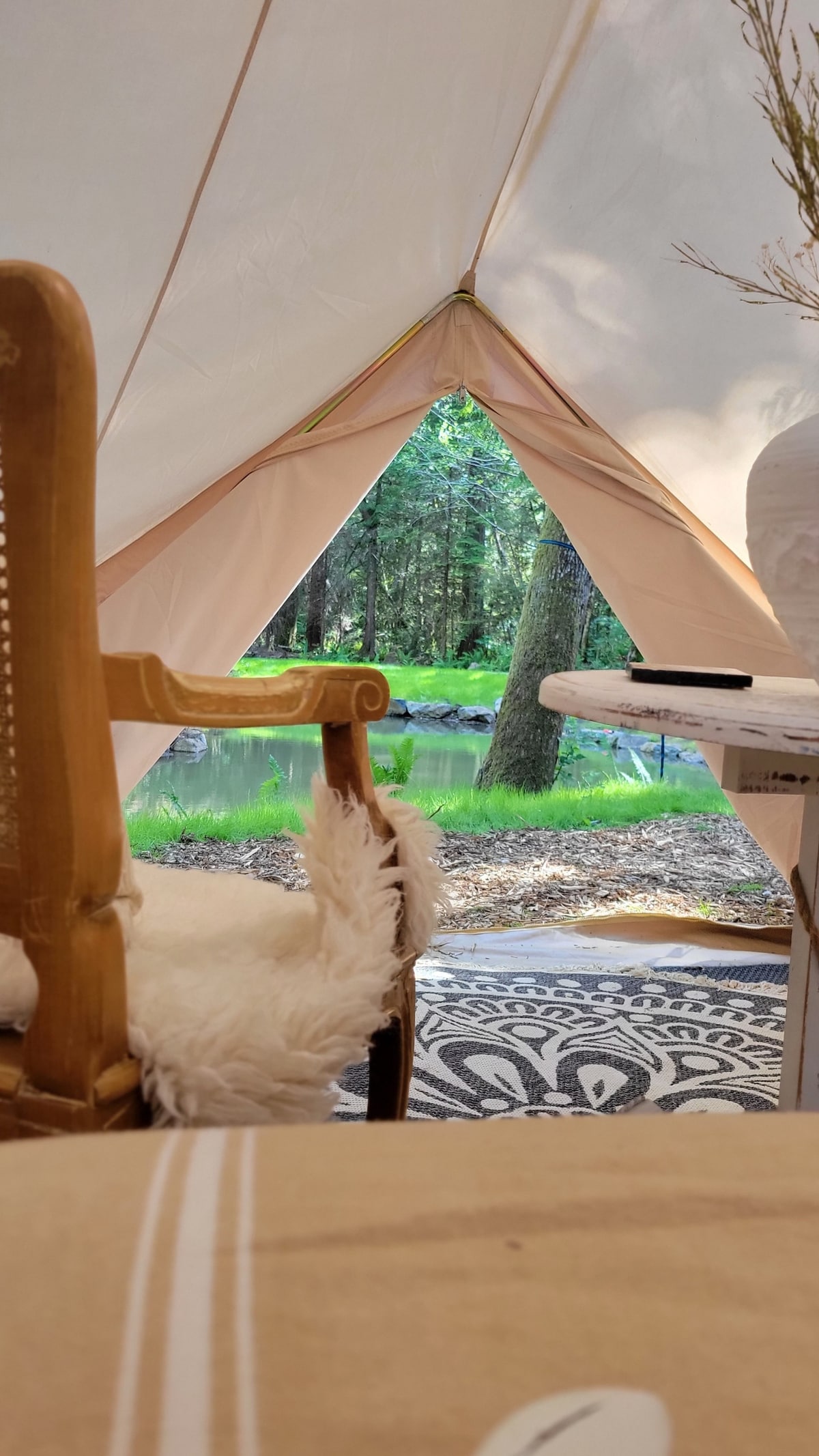 Beautiful, spacious Bell Tent nestled next to a large pond in a private, serene, forested setting on Salt Spring Island. Sleeps four comfortably with queen sized bed, daybed and floor mattress. Amenities include outdoor kitchen, pond-side cedar deck for dining and lounging, additional seating areas, outdoor hot water shower and composting toilet. Kayaks, bocce, badminton, slack line. An Ideal spot for romantic getaways or great family fun.