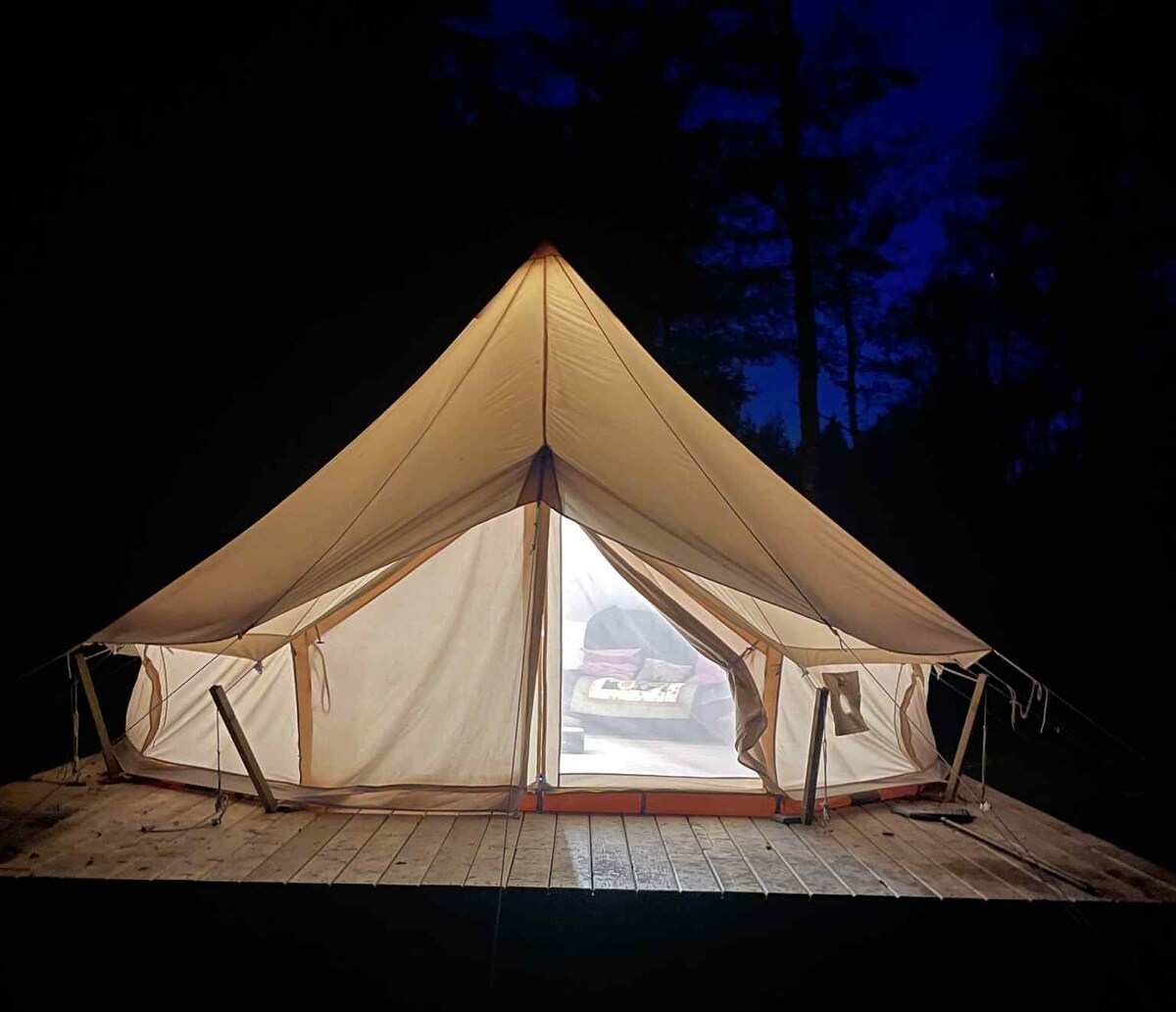Camp in luxury in our 306 sq. ft. furnished canvas bell tent! Enjoy a queen bed, futon, dining area & dining tent. Close to 3 lakes for boating, fishing & swimming. Relax by your private fire with seating for sunsets, stargazing & moonrises. Nestled in old-growth boreal forest, soak in nature’s peaceful sounds. Linens ($25/bed), tent heater ($45), firewood ($18/tote) & propane ($30) available. Pillows, hand towels, dish towel, soap & potable water provided. No pets. Extras +GST.