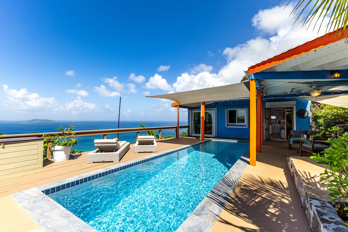 Take it all in at this unique and tranquil oasis. Perched on top of Spyglass Hill in West (Best) End of Tortola, this unique villa is your home away from home. With stunning views of Jost Van Dyke and its surrounding islands, you are promised one of the best sunset views in the BVI all while relaxing in one of the hammocks or floating in the pool!