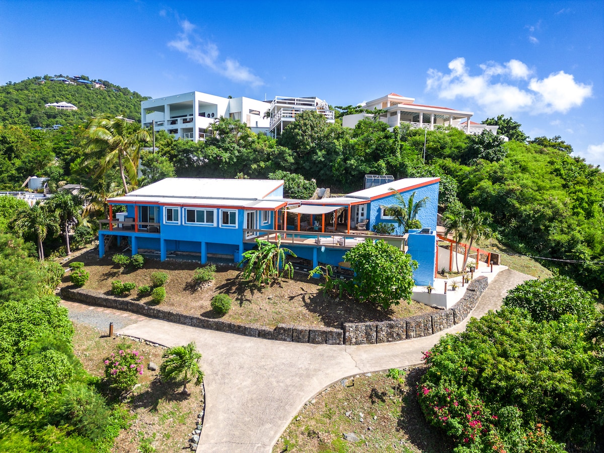 Take it all in at this unique and tranquil oasis. Perched on top of Spyglass Hill in West (Best) End of Tortola, this unique villa is your home away from home. With stunning views of Jost Van Dyke and its surrounding islands, you are promised one of the best sunset views in the BVI all while relaxing in one of the hammocks or floating in the pool!