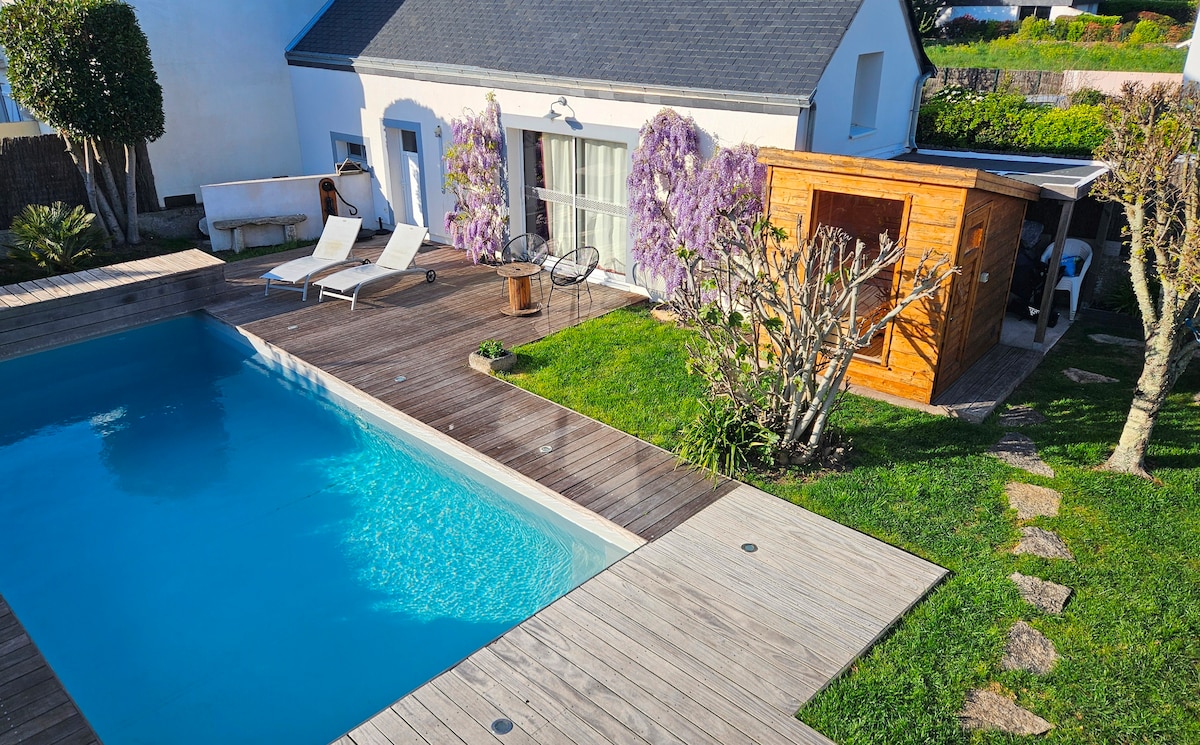Proche du charmant village de Kermorvan, à 1km du centre ville, 100 m des plages côté baie, du sentier côtier et de Port Haliguen, venez découvrir notre chambre privée, "art déco 1930" exposée plein sud, au bord de la piscine. Les cinéphiles reconnaîtront le clin d'œil à David Lynch! Le petit déjeuner est servi dans la chambre avec panier pique-nique. Le centre-ville, la grande plage et l'embarcadère pour les îles se situent à 1 km environ à pied, la gare à 800m.