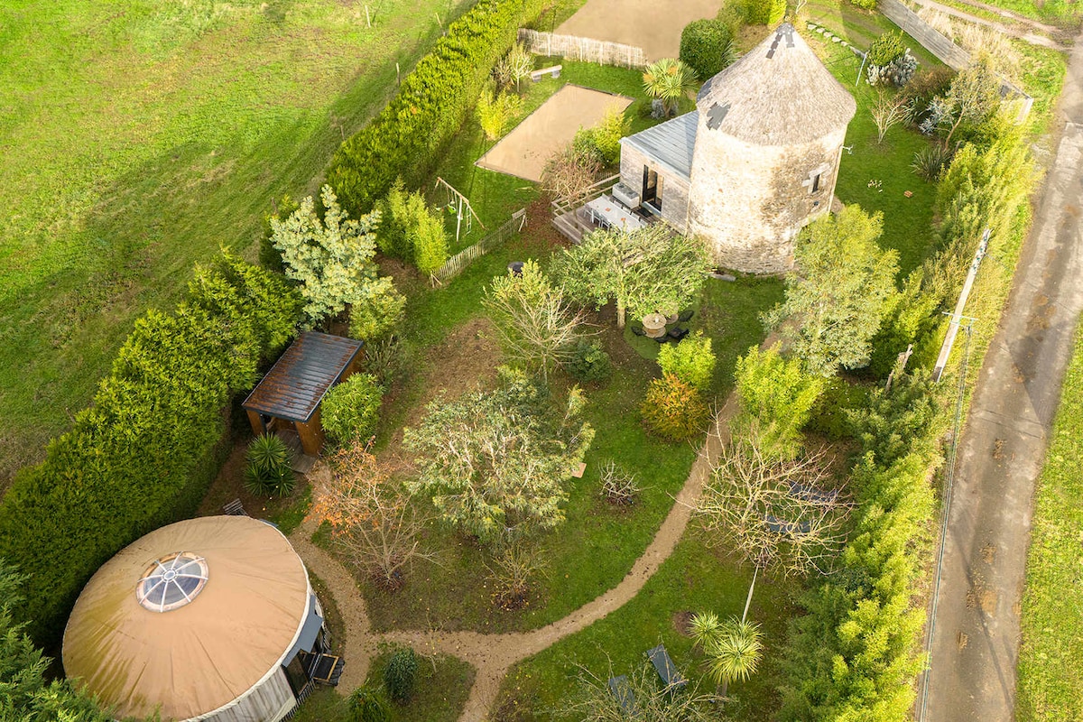 Enjoy a peaceful stay in a unique countryside setting, close to the Bay of Mont-Saint-Michel, Cancale and only 10 minutes from Saint-Malo. We offer two unusual accommodations on a fully landscaped natural site, ideal for memorable moments with family or friends: • a fully renovated former mill that can accommodate up to 4 guests, • and a comfortable yurt for up to 5 guests. The household linen (bed sheets and towels) is included in the price and will be placed on each bed, in plastic packaging.