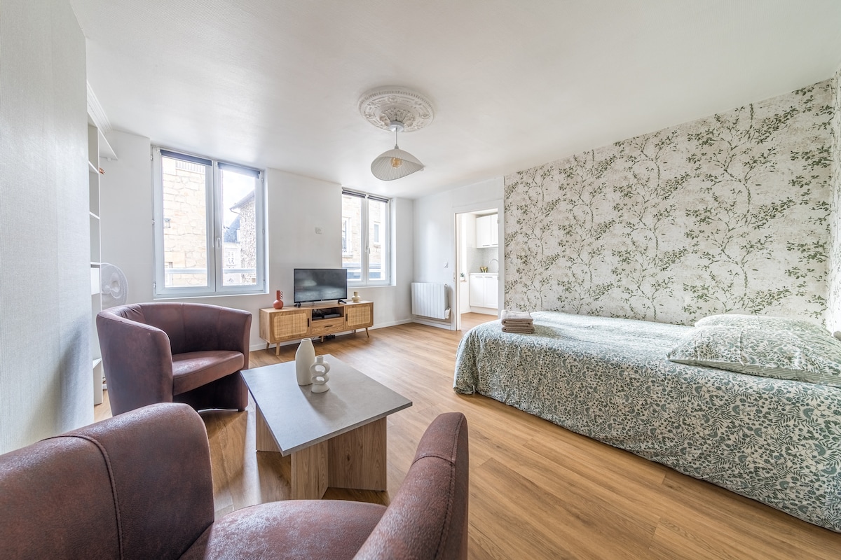 Grand studio rénové équipé au Cœur Historique A disposition au sein du logement : - Linge de lit et serviettes - Produits d'accueil: thé, café, madeleines, gel douche - WIFI Fibre - Smart TV - Machine à laver/séchante - Lave vaisselle - Four micro-onde grill - Plaque induction - Machine à café Senseo - Bouilloire - Frigo - Mini dressing En option: - Petit déjeuné au restaurant Chez Rosette 8€ /pers - Départ tardif 13h / supplément 10€ Arrivée autonome à partir de 16h et départ avant 11h