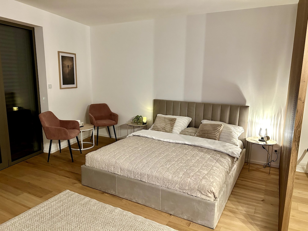 We offer luxurious accommodation up to 4 guests in the quiet Černá Pole area, just a short distance from the center of Brno. The apartment features a bedroom with a double bed, a room with a foldable double bed, a spacious living room with a 4K TV, and a fully equipped kitchen. The bathroom includes a corner bathtub 🛀, a bidet, and a toilet, plus an additional separate toilet. Relax on the large terrace with a shower or in the garden. 🚙Private parking is available. Wi-Fi is fast and strong! 🔥