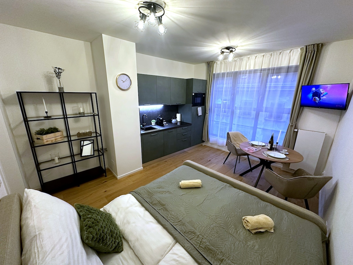 Modern city studio in a brand-new residential project, featuring a comfortable double bed for two guests. The studio includes a equipped kitchenette, a Nespresso coffee machine with starter capsules, tea. Guests can enjoy Netflix on the TV and use a personal safe for valuables. The private bathroom offers a walk-in shower, fresh towels and basic toiletries provided for the stay. Quiet urban location with excellent tram access to Brno city center, ideal for business travelers and couples.