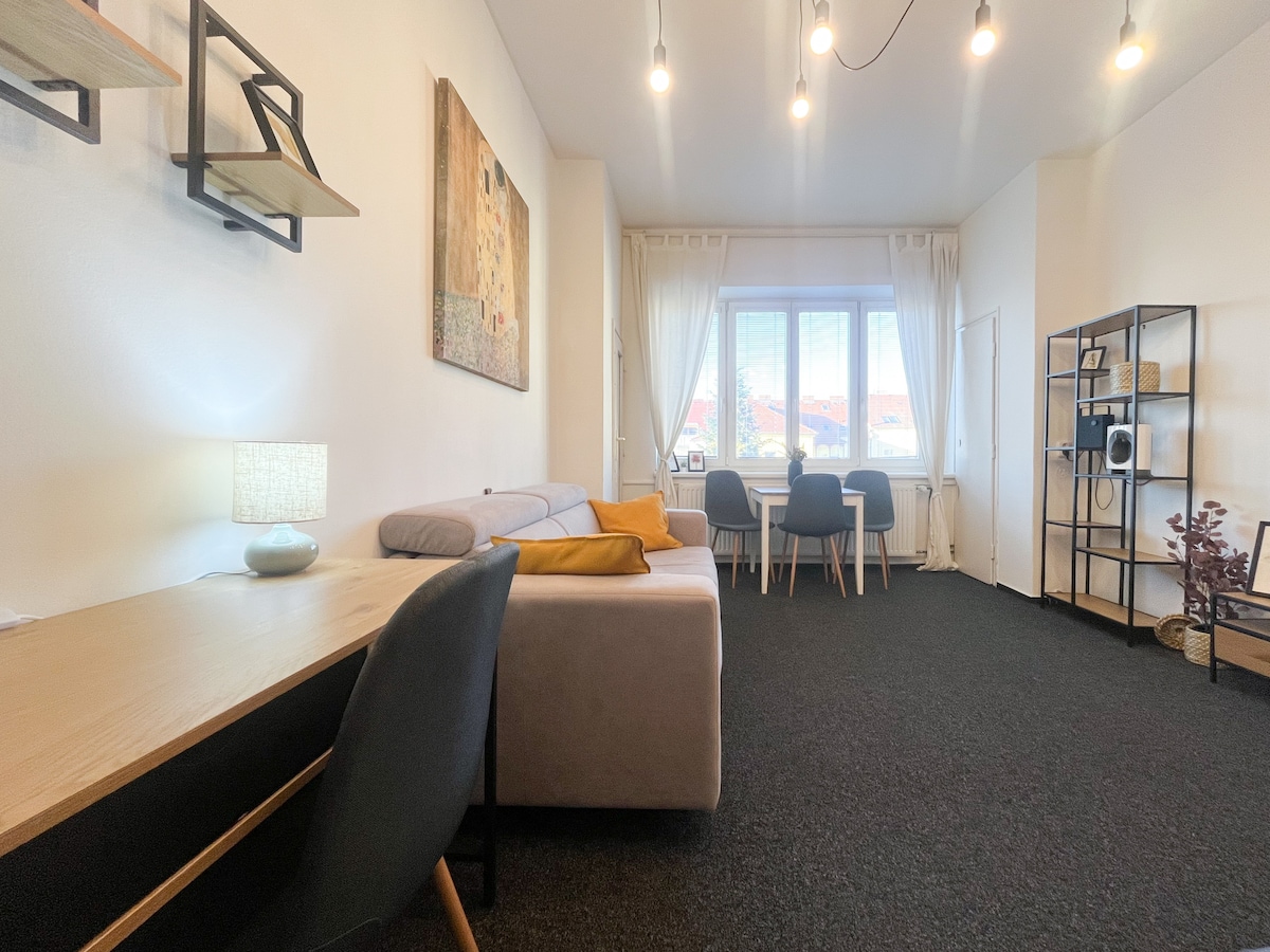 Pěkný a zařízený apartmán o celkové výměře 37 m2 s vlastní kuchyní a koupelnou. Nachází se v širším centru města Brna (cca 10 minut pěšky od Moravského náměstí.) V koupelně je k dispozici rohová vana i sprchový kout. Kuchyně je vybavená troubou, lednicí, mrazákem a indukční deskou. Je zde TV, skříně, gauč, křeslo, pracovní stůl, stolek). Parkování zdarma v objektu (průjezdem do vnitrobloku pohodlně projedou malá a středně velká vozidla). Jsou zde předplacené aplikace Netlfix a Sledování TV.