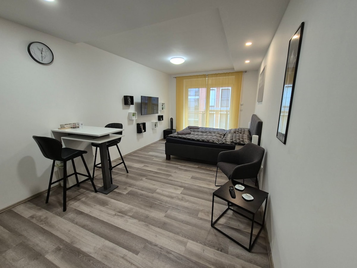 New modern and cozy apartment in the old part of Brno right next to the Exhibition center, Starobrno brewery and city center. Located in a calm street, fully equipped with one bed room and a balcony for a nice evening chill out. You will be located about 2 minutes walking distance from the exhibition center and about 5 minutes walking distance from the city center.