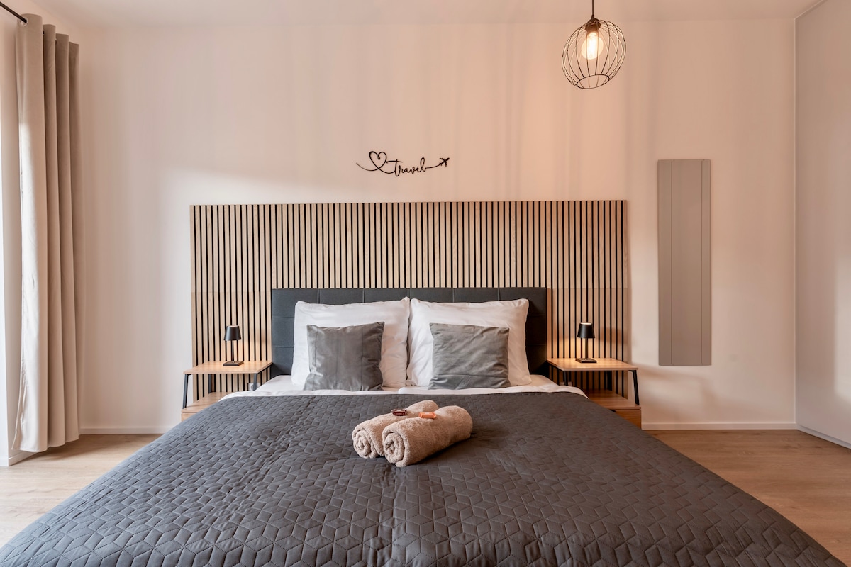 The 44 m² apartment offers a spacious living room with a kitchenette, featuring a comfortable sofa, an armchair, a dining and work table, and a wall-mounted TV. Two large windows provide a beautiful view of the garden and allow plenty of natural light to fill the room. The separate bedroom, furnished with a 180x200 cm double bed, offers the perfect place to relax after a day full of experiences in Brno. Additionally, the apartment provides a stable and high-speed Wi-Fi connection.