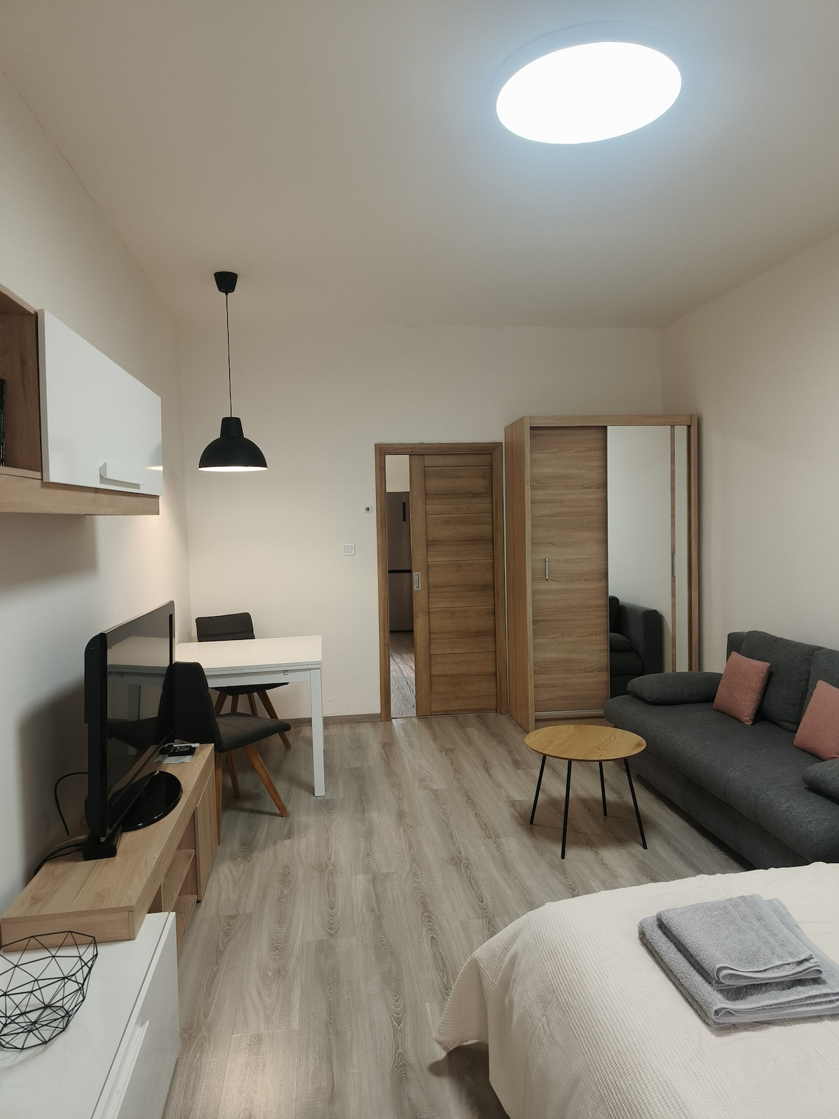 Vítejte v našem moderním apartmánu! Nachází se na klidné ulici v srdci města, ideální pro páry, obchodní cesty nebo rodiny s dětmi. Apartmán nabízí ložnici s manželskou postelí, obývací pokoj s rozkládací pohovkou, plně vybavenou kuchyň a moderní koupelnu. K dispozici je Wi-Fi zdarma, TV, pračka, sušička a parkování. Blízko turistických atrakcí, restaurací a MHD. Rychlý a bezkontaktní check-in a check-out, domácí zvířata jsou povolena. Přijďte si užít pohodlí a styl!