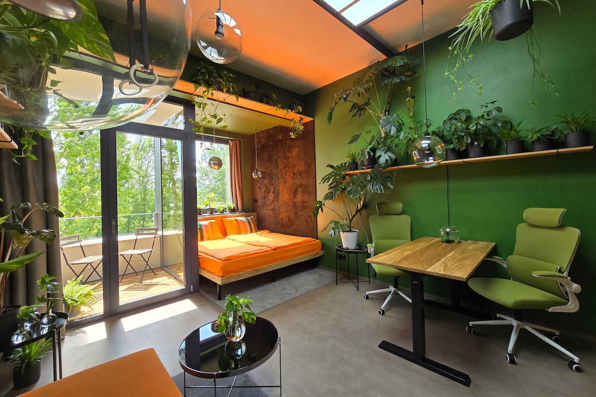 Welcome to the Revitalizer, a unique place with lots of green plants to relax and recharge your mind and body. Full shading is in place as well as adjustable lights (ranging from white, yellow to red lights). The apartment offers a high-speed wifi, king size bed, standing desk and comfortable ergonomic chairs as well as a fully equipped kitchen. Discover this calm oasis in the center of Brno.