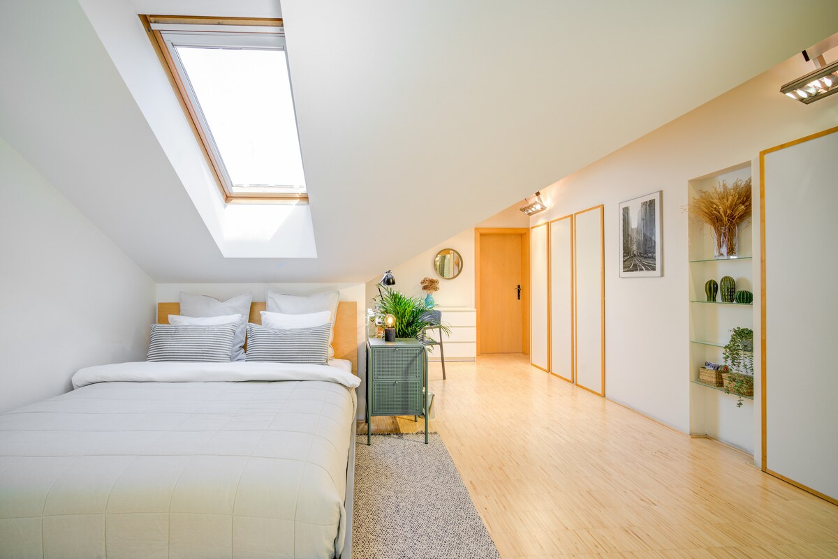 This rooftop studio, measuring 46 m² is located in a quiet part of the building and is ideal for those seeking a peaceful stay. The skylights provide plenty of natural light, creating a bright and airy atmosphere. The studio features a comfortable queen-size bed (160×200 cm), a fully equipped kitchen (compact but with everything you need), and a bathroom with a shower. It is suitable for one or two guests. Note: The apartment is not suitable for elderly guests due to narrow stairs.