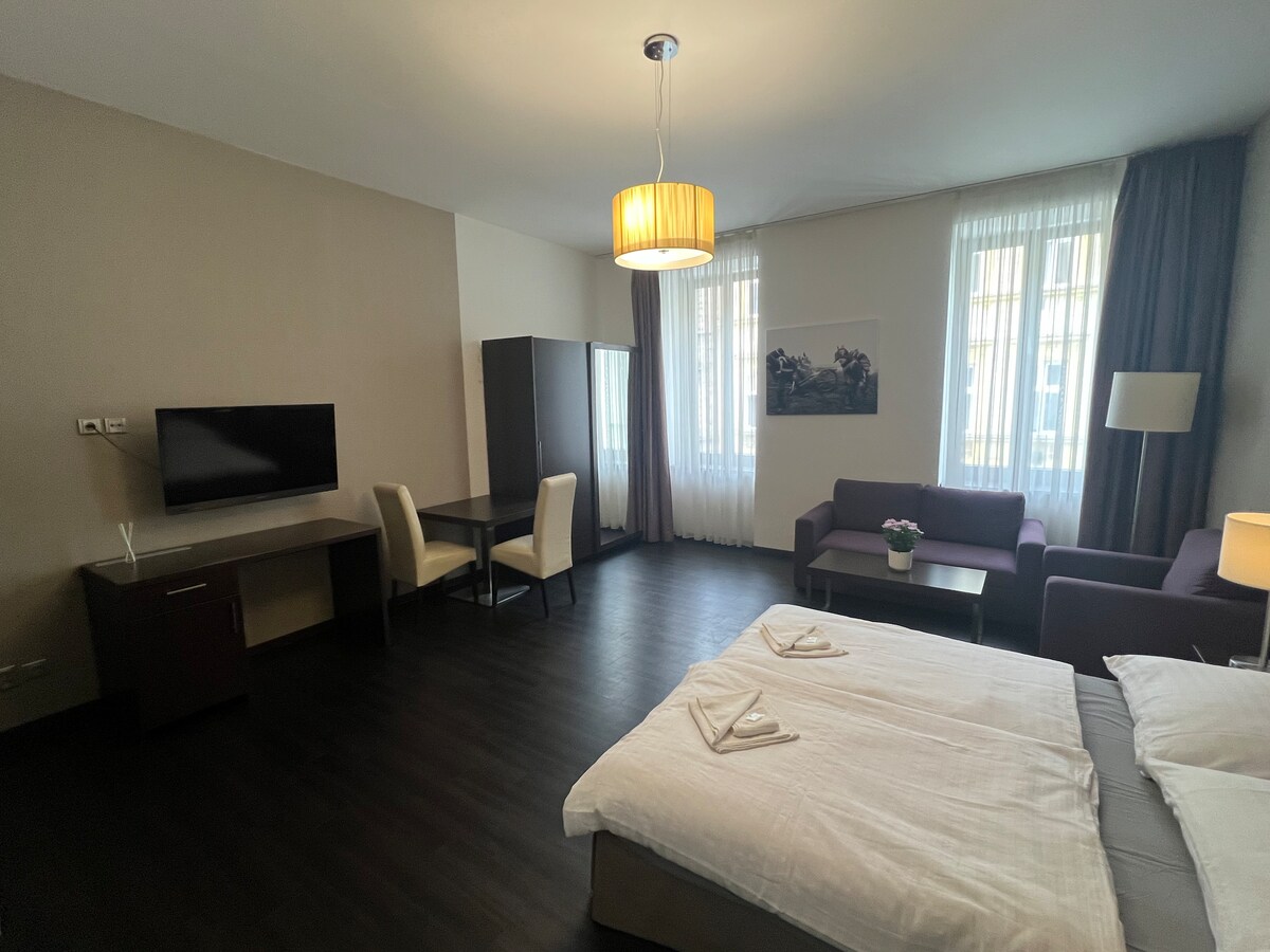 This bright and comfortable 30 m² studio offers an ideal space for relaxation and long-term stays. Located in a quiet part of the building, with windows facing the inner courtyard and a private balcony where you can enjoy your morning coffee or unwind in the evening. The studio features a large king-size bed (180×200 cm) and a fully equipped kitchen, allowing you to prepare your favorite meals. We highly recommend this studio for those seeking a quiet and comfortable stay with plenty of space.