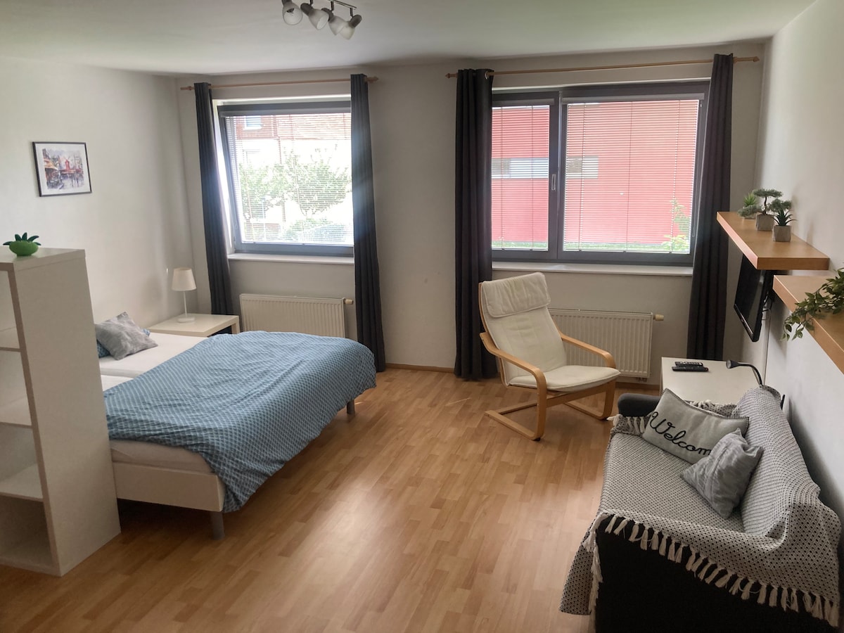 Byt leží poblíž centra města a je v klidné části, blízko MHD, obchody, kavárny, restaurace. Prostorný byt má 50m2. V bytě je jeden pokoj s kuchyňským koutem. Prostorná šatna s vestavěnou skříni a koupelna s toaletou a pračkou. V hlavním pokoji je jedna dvoulůžková postel s polohovacím roštem a rozkládací sedačka (1 dospělý nebo 2 děti). Kuchyňský kout je plně vybaven - trouba, lednička, sporák, nádobí… Od centra města je ubytování vzdálené 10 min pěšky nebo 5 min MHD. Blízko výstaviště a Campusu