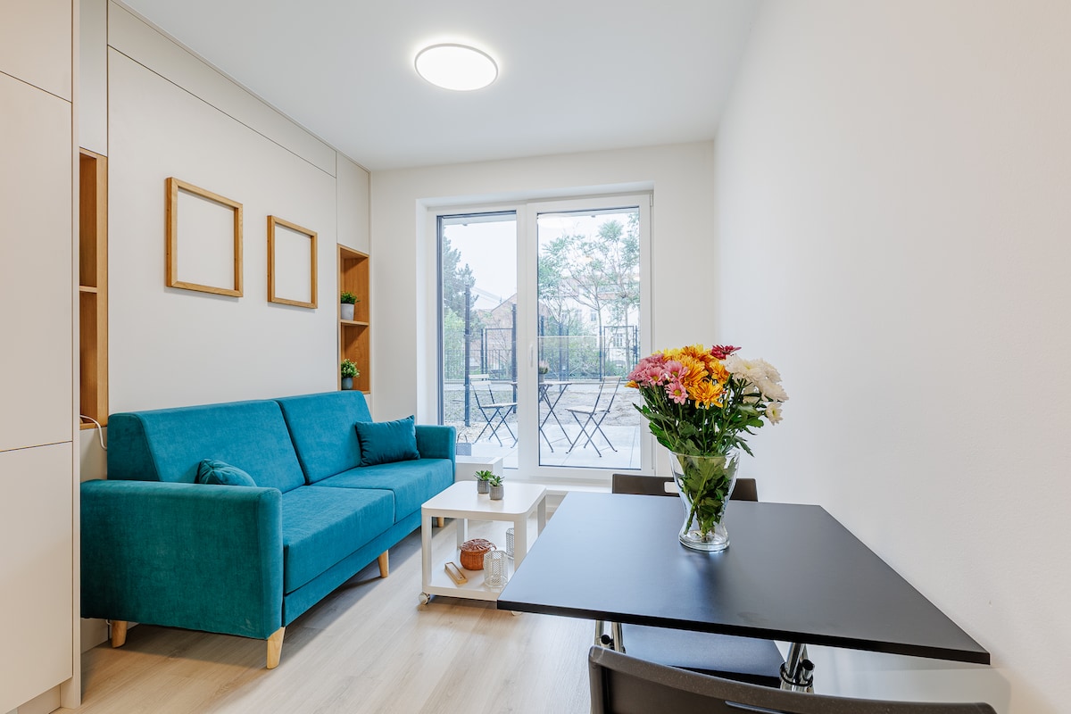 Modern, sleek design. Central location! This is a brand new studio apartment in a recently renovated building. It's been thoughtfully designed to comfortably accommodate up to four people and provide everything you may need for your short or even long-term stay in Brno. Be one of the first guests in this modern and stylish new studio that boasts a full kitchen, a double bed, a sofa bed, a large flat screen TV and a mini terrace with peaceful views. All this a few minutes from the city centre.