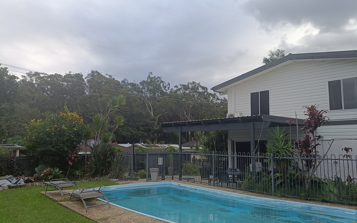 Whole house and pool is yours! This is a large 2 storey, 4 brm, 3bthm home with a pool, only 18 mins walk to the beach. Now boasting an 85 inch 4k Samsung TV...book in for family movie night! Large lounge and dining area, looks over the magnificent tropical pool. BBQ by the pool and enjoy the peaceful, quiet neighbourhood. This large entertainer's house will sleep up to 10 people comfortably. All 4 rooms have queen-size beds and there is a sofa lounge and two king singles.