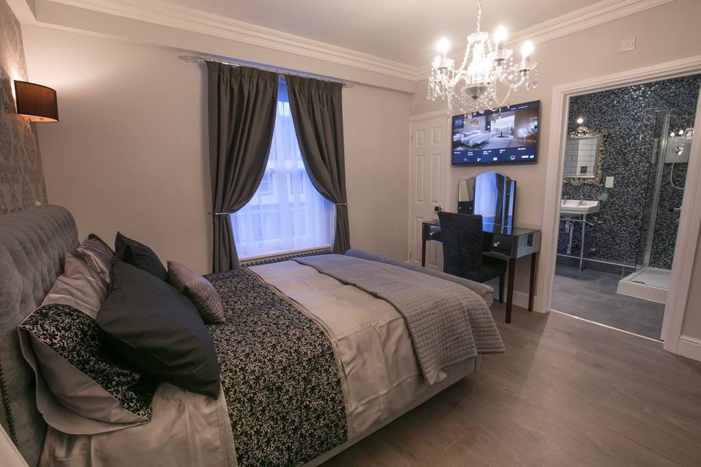 A neutral palette of creams and browns and soft greys colour the walls, blended with stylish wallpaper feature walls and lovely bed linens. Delightful tables and chairs fit snugly into the apartment, with a smart TV arranged over for easy viewing from the comfortable double bed. From here, it’s an easy distance to the tastefully equipped apartment kitchen. No bulb is too bright and there's no unwelcoming chill, everything is just so, as it would be found in the home of a house-proud family member, including Wi-Fi throughout! The stylish bathroom with its elegant gilded mirror, mosaic feature wall and large, power shower and complimentary toiletries, is complemented by natural light from the window.
