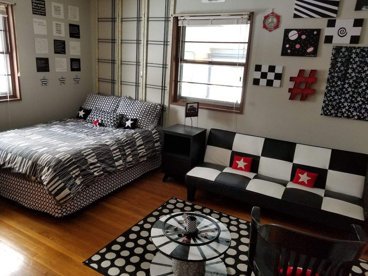Private suite in convenient midtown location (just 5 minutes to popular Mass Ave and Broad Ripple attractions). Private side entry with digital access. Brand new queen bed, full bathroom, kitchenette, WiFi, large Smart TBV, easy street parking, large built-in shelves for storage and spacious closet. Complimentary snacks, teas and local coffee. This space is newly renovated.