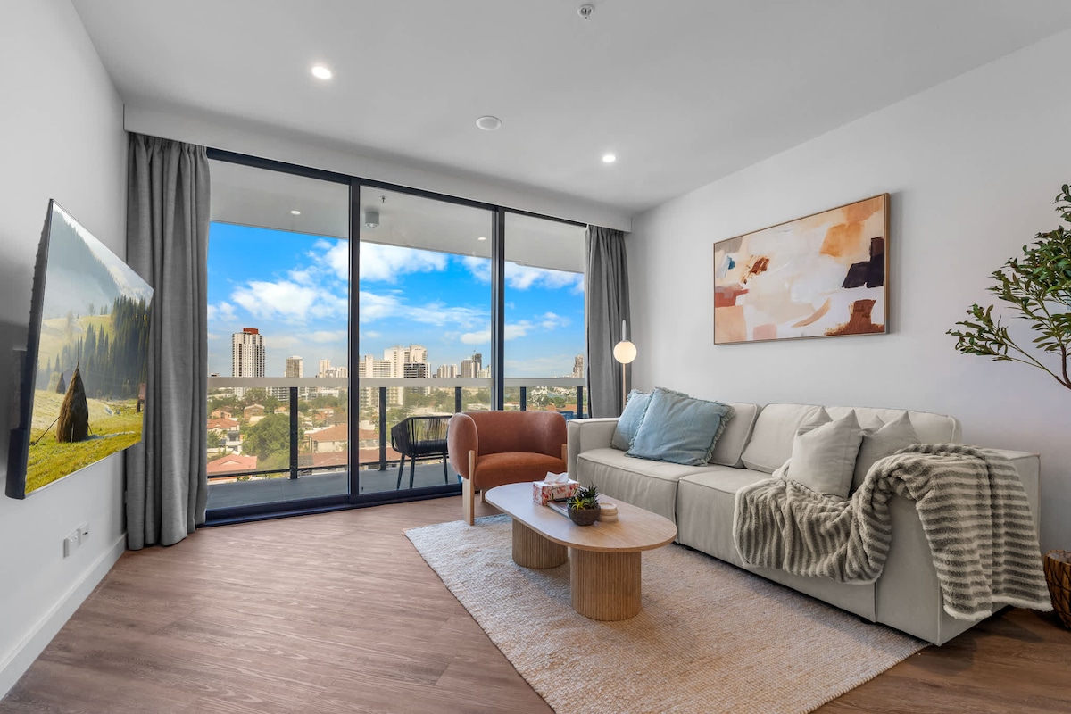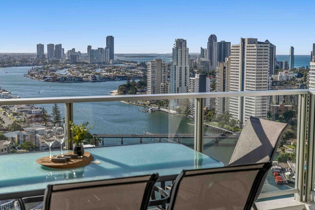 Experience luxury on the 27th floor with breathtaking, uninterrupted Broadwater views. This modern 2-bed, 2-bath Southport apartment comfortably fits 4 guests. Enjoy floor-to-ceiling windows, a private balcony, fast WiFi, dedicated workspace, bathtub, BBQ grill, central a/c, self-checkin and full access to resort-style facilities including pools, a spa, and a gym. Perfectly located with a tram stop at your doorstep, it's the ultimate Gold Coast escape.