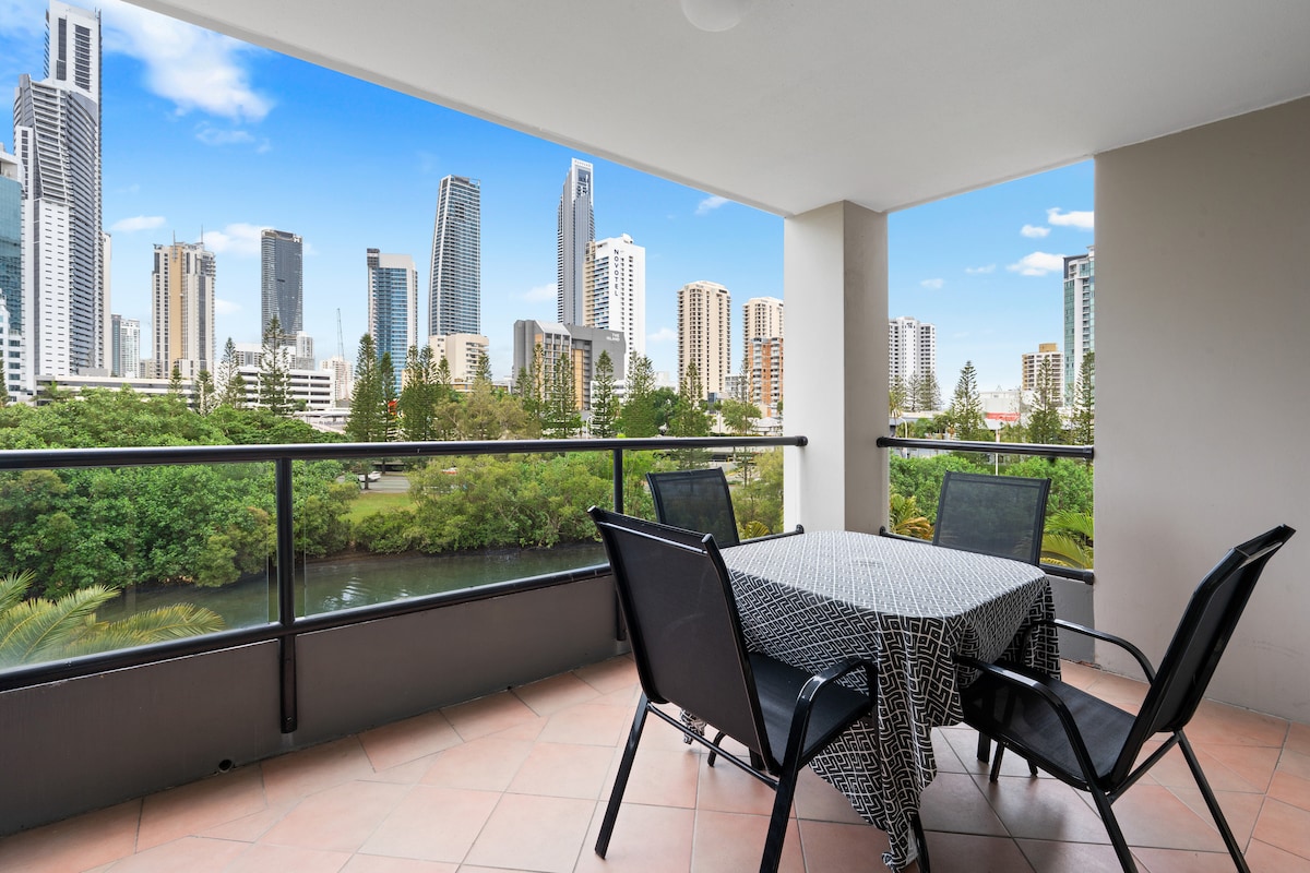 Welcome to our ground-floor 1BR studio, complete with a queen bed, full kitchen, and Wi-Fi. Pet lovers rejoice - we're dog friendly (house rules apply)! Relax on your private outdoor patio or take advantage of the resort's amenities, including swimming pools, spa, gym - all with river views. Paid parking is conveniently available with rates provided in your booking details. With the tram, Cavil Av, and the beach just 10 min away, you're positioned to experience Surfers Paradise!
