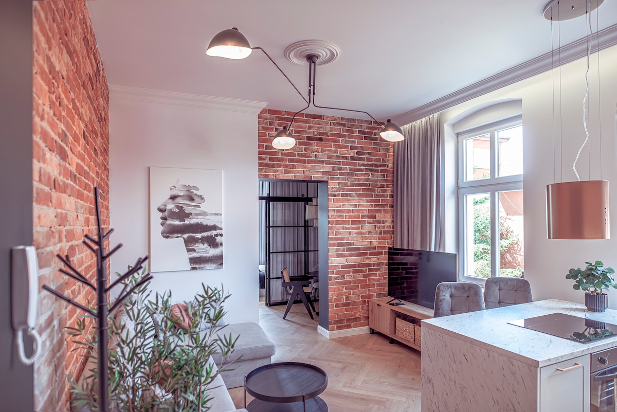 Dwupoziomowy apartament z tarasem w centrum malowniczej Toruńskiej Starówki. Projekt tego miejsca nawiązuje do historii związanej z życiem Mikołaja Kopernika. Jest tu połączenie nowoczesności i elegancji ze średniowiecznym charakterem domu. Mieszkanie pomimo centralnej lokalizacji, jest bardzo ciche, ponieważ okna nie wychodzą na główna ulicę. Czyni to je miejscem idealnym na relaks i ucieczkę od zgiełku bez wychodzenia ze Starego Miasta. Taras na dachu jest wyjątkowym atutem tego mieszkania.