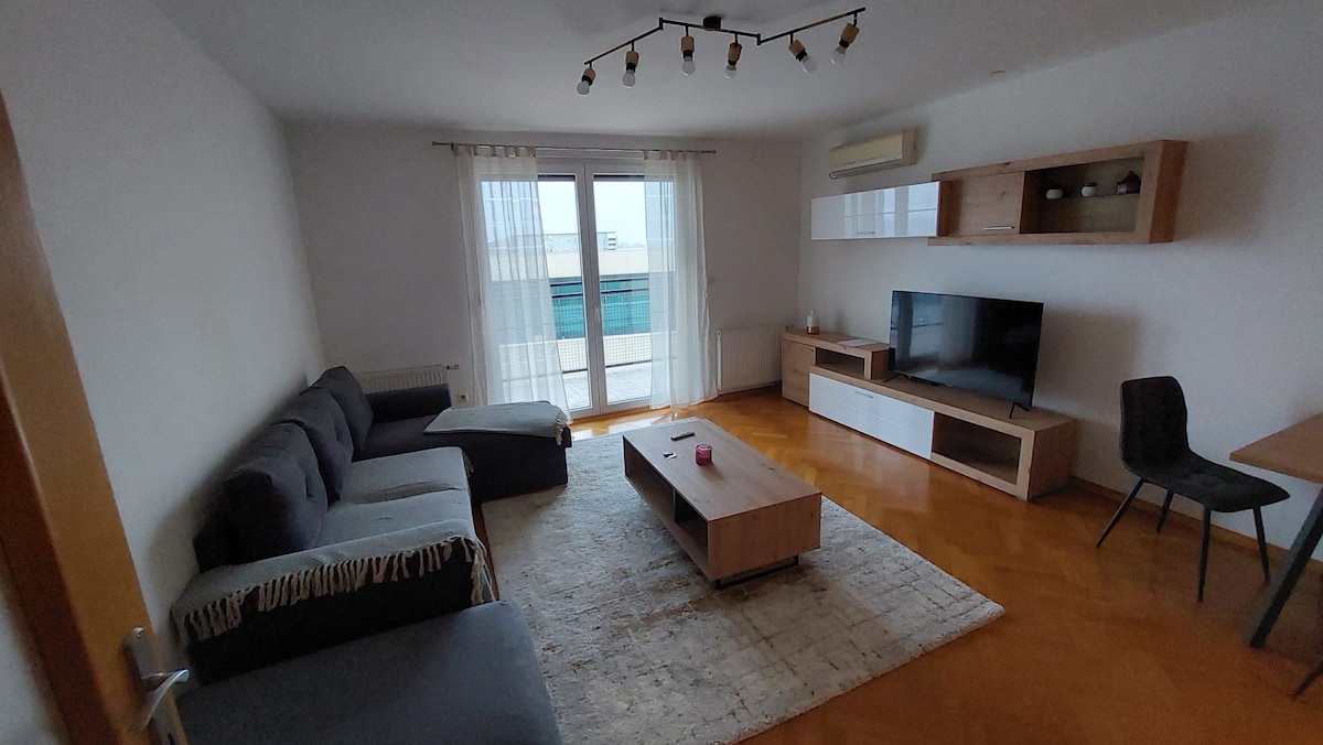 Enjoy a stylish experience at this industrial apartment located in the center of the city next to main square, bank of river Sava and historical fortress. View from the 9th floor (and one small balcony) overlooking city biggest park is also included. And some other perks as well.