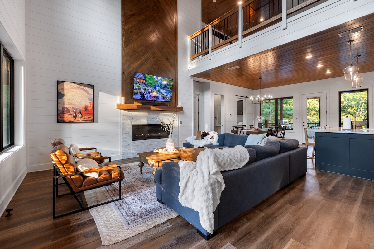 The Legend of Broken Bow by @TheVacayGetaway ⭐️New, luxury cabin on a wooded lot with expansive mtn views ⭐️TREX MURAL, life-sized dinosaurs, slide/rock climbing/arcade ⭐️Hot tub, putt putt, hammock chairs, cornhole, outdoor TVs ⭐️Two large decks with outdoor fireplace/dining/lounges ⭐️2 King ensuite bedrooms+twin over twin bunk bed landing ⭐️Gas grill/wood burning firepit ⭐️ROKU TVs in every room ⭐️Keurig/drip coffee 🚙 Pkg for 4, EV plug 📍 8 mi Hochatown 📍 9 mi Beaver's Bend