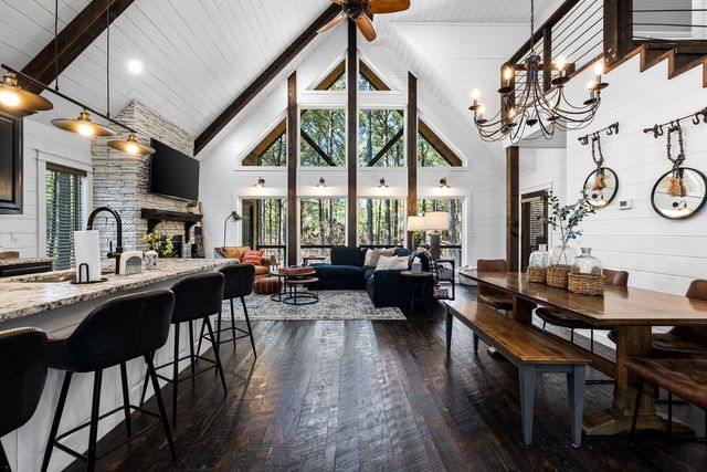 Welcome home to Big Sky Mountain Lodge -Your 3 story luxury cabin located right off the National Forest boundary. Soaring pine & hardwood trees along with mountain & lake views await you as you pull up. Perfect for families and groups traveling together, the home is equipped with 3 Master bedrooms (KINGS), 3.5 baths and a bunk room that sleeps 6, game-room downstairs with separate living space for the kids including their own bathroom and living area . Well appointed kitchen & wrap around decks