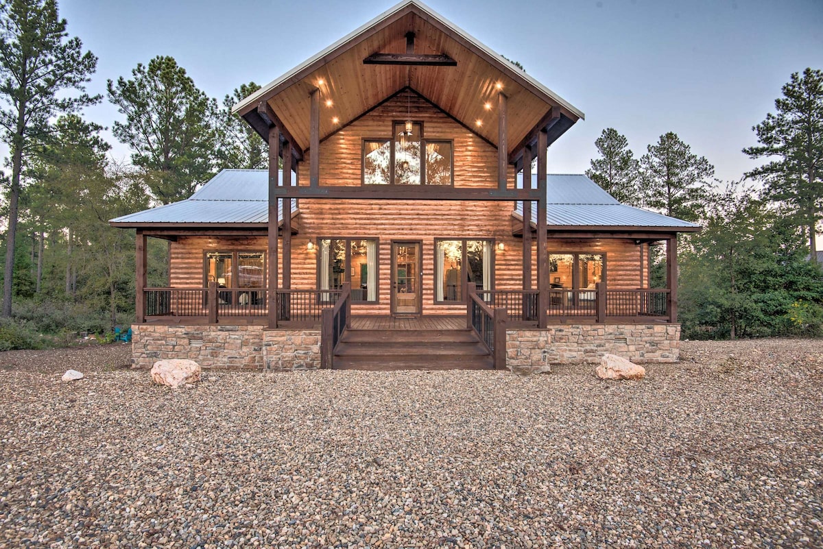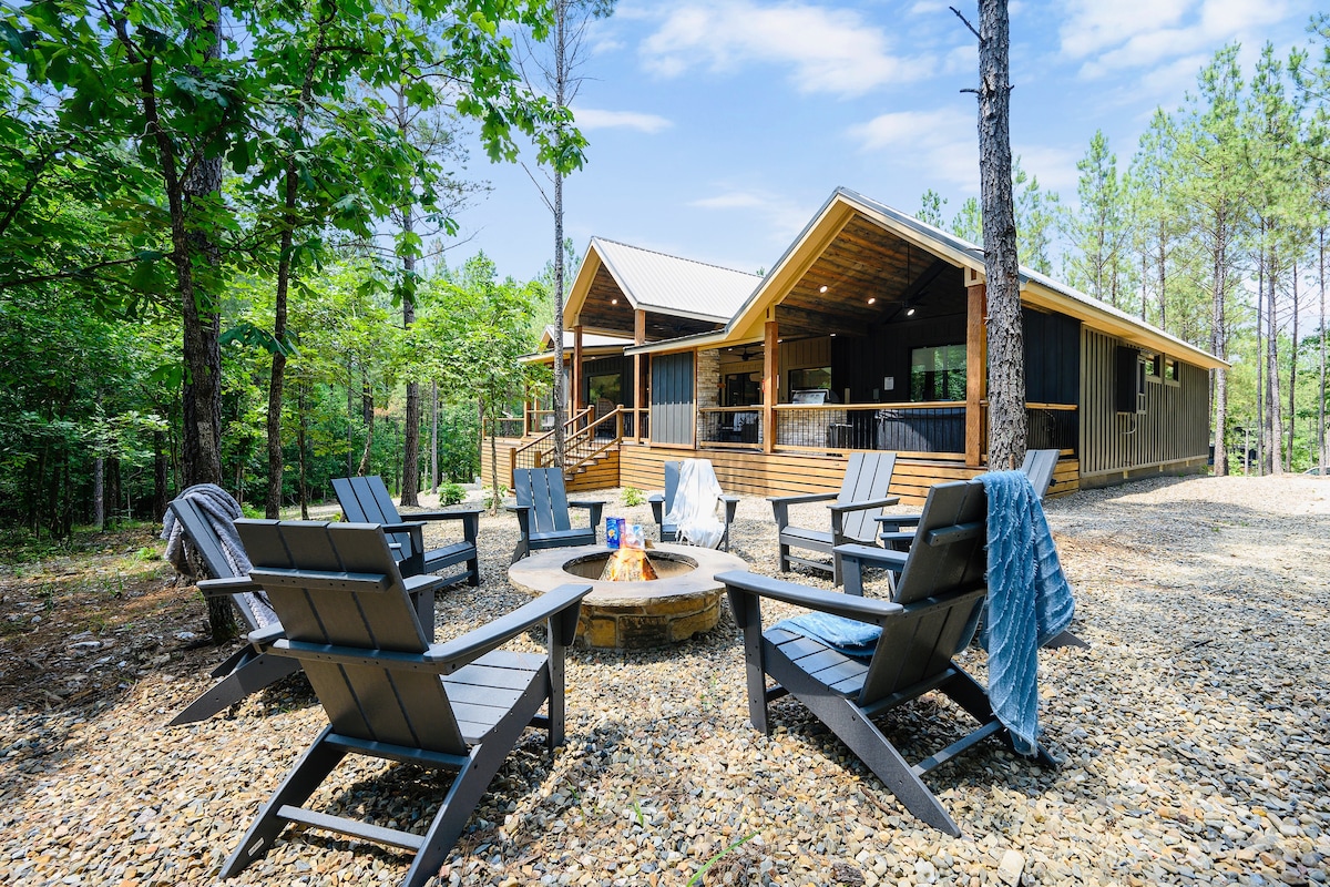 Experience the beauty of nature without sacrificing luxury in this brand new cabin in Broken Bow! With both river and pond access, fishing and water enthusiasts will never run out of things to do. This luxury 4 bedroom home in a gated community sleeps up to 14 guests, and features a game room, chef's kitchen, hot tub, and firepit area. ⤢ 12 miles to downtown Broken Bow ⤢ 20 miles to Choctaw Landing ⤢ 26 miles to Broken Bow Marina/Lake